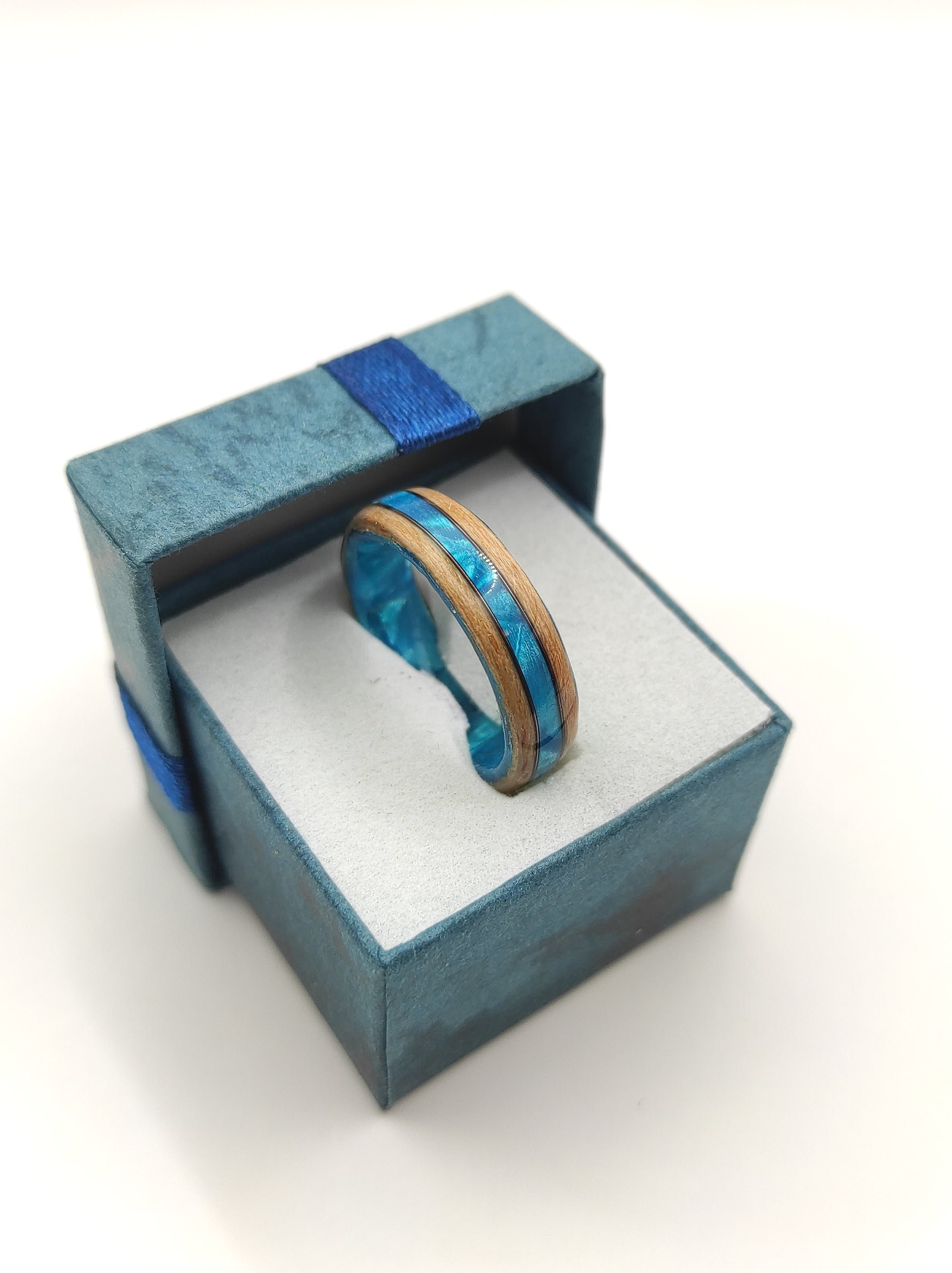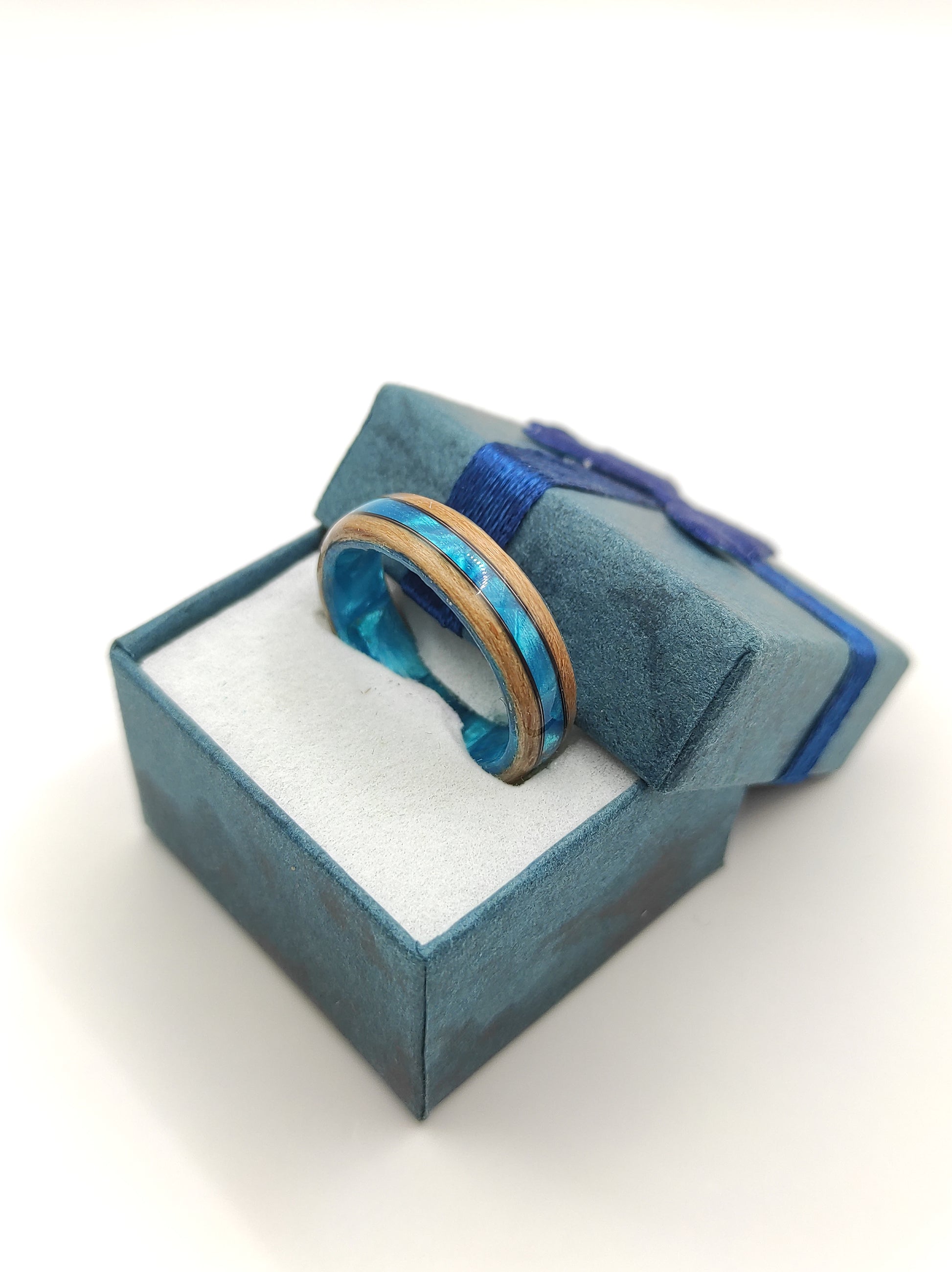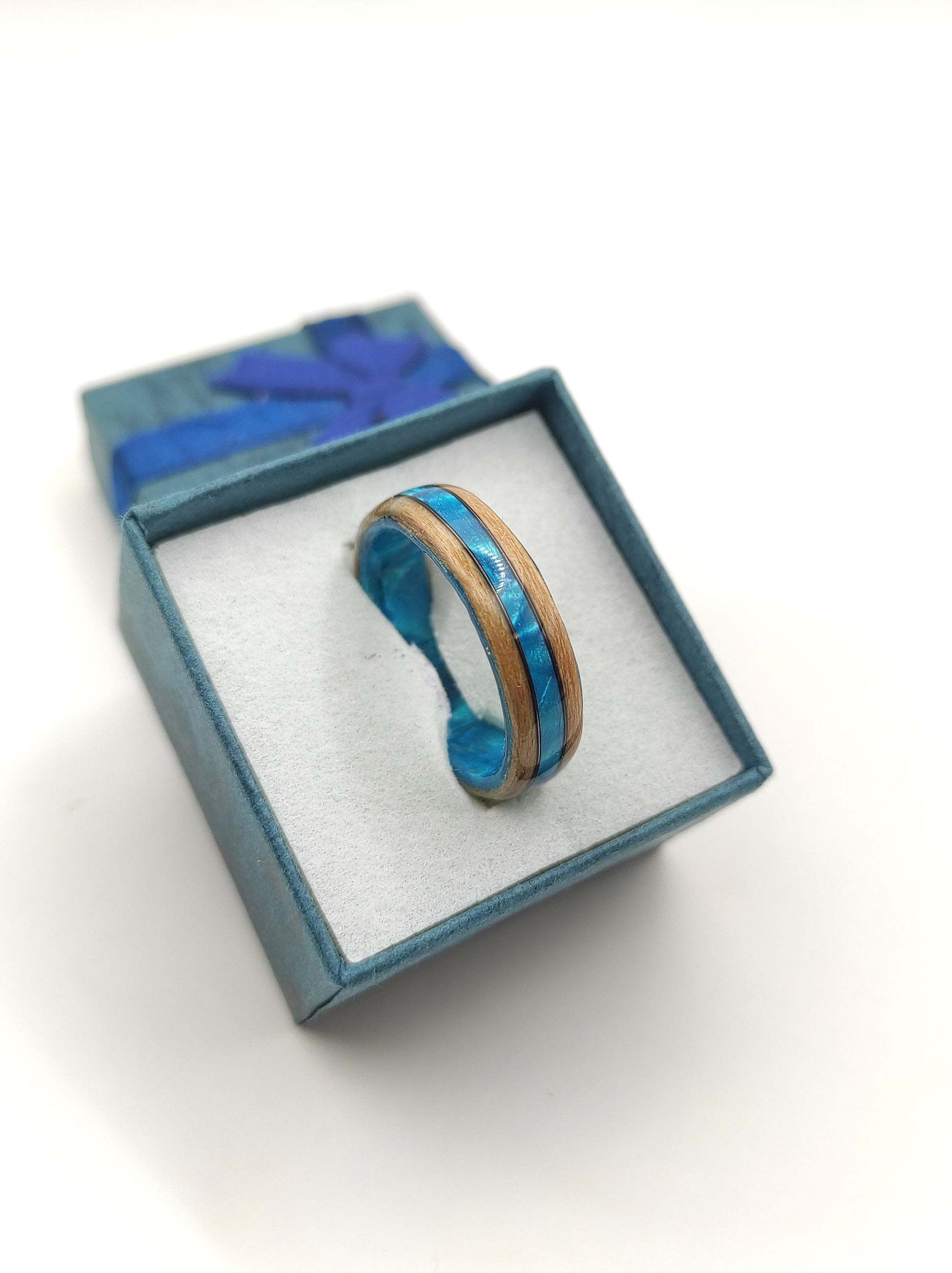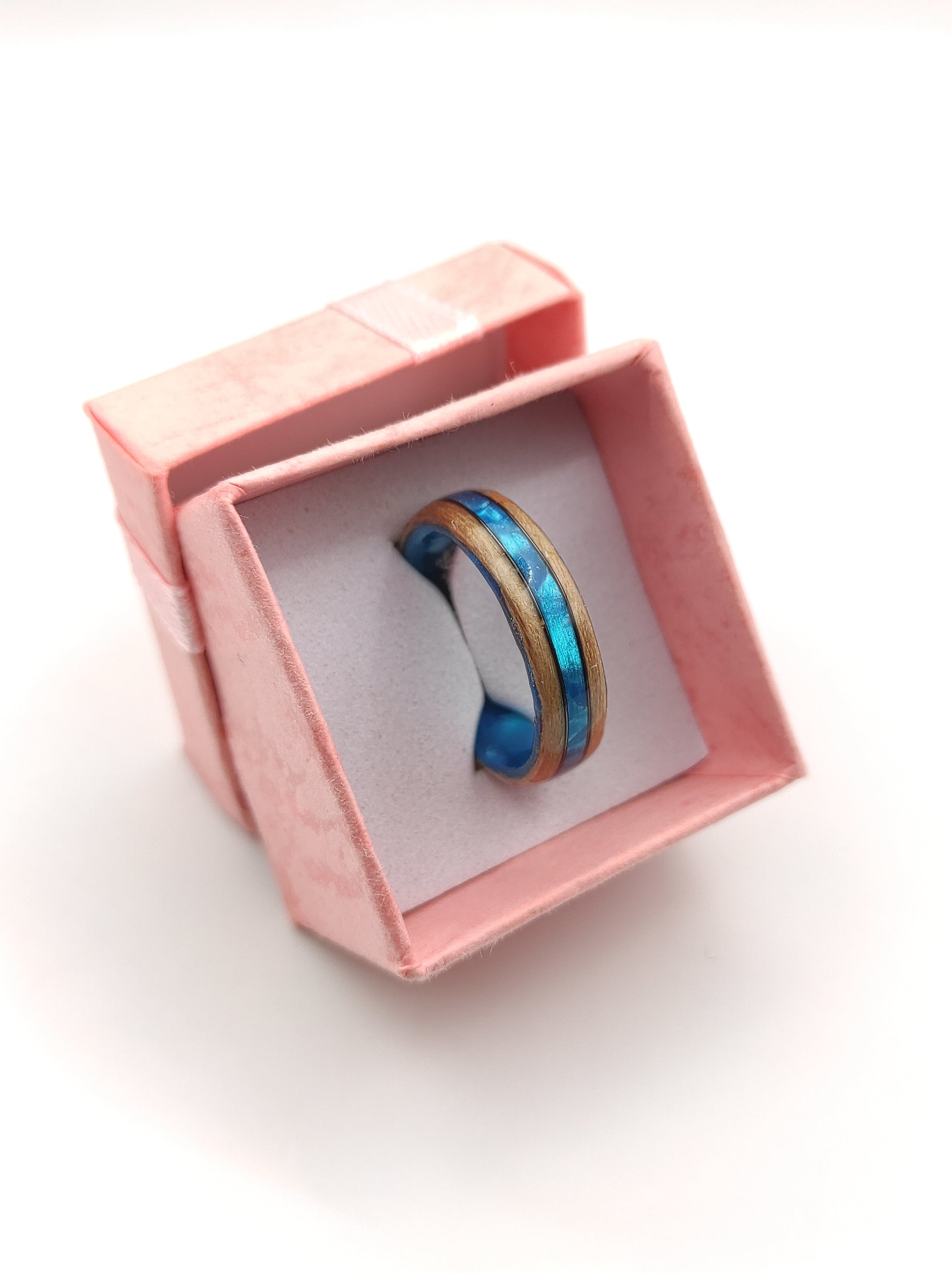 Zanurz się w kolorze błękitu — pierścionek Błękitna Przestrzeń to połączenie ciepła naturalnego drewna i głębi niebieskiego celuoidu.