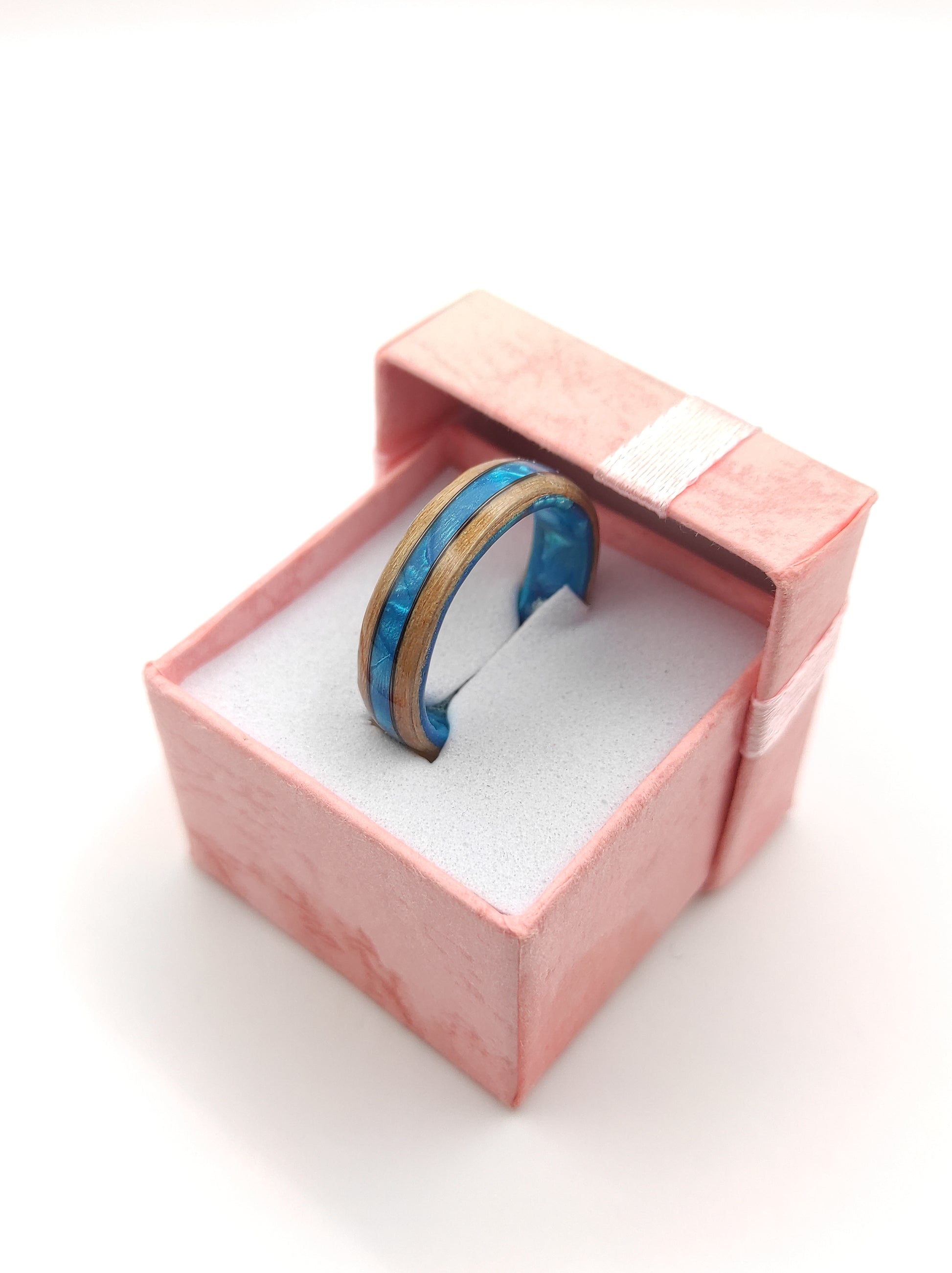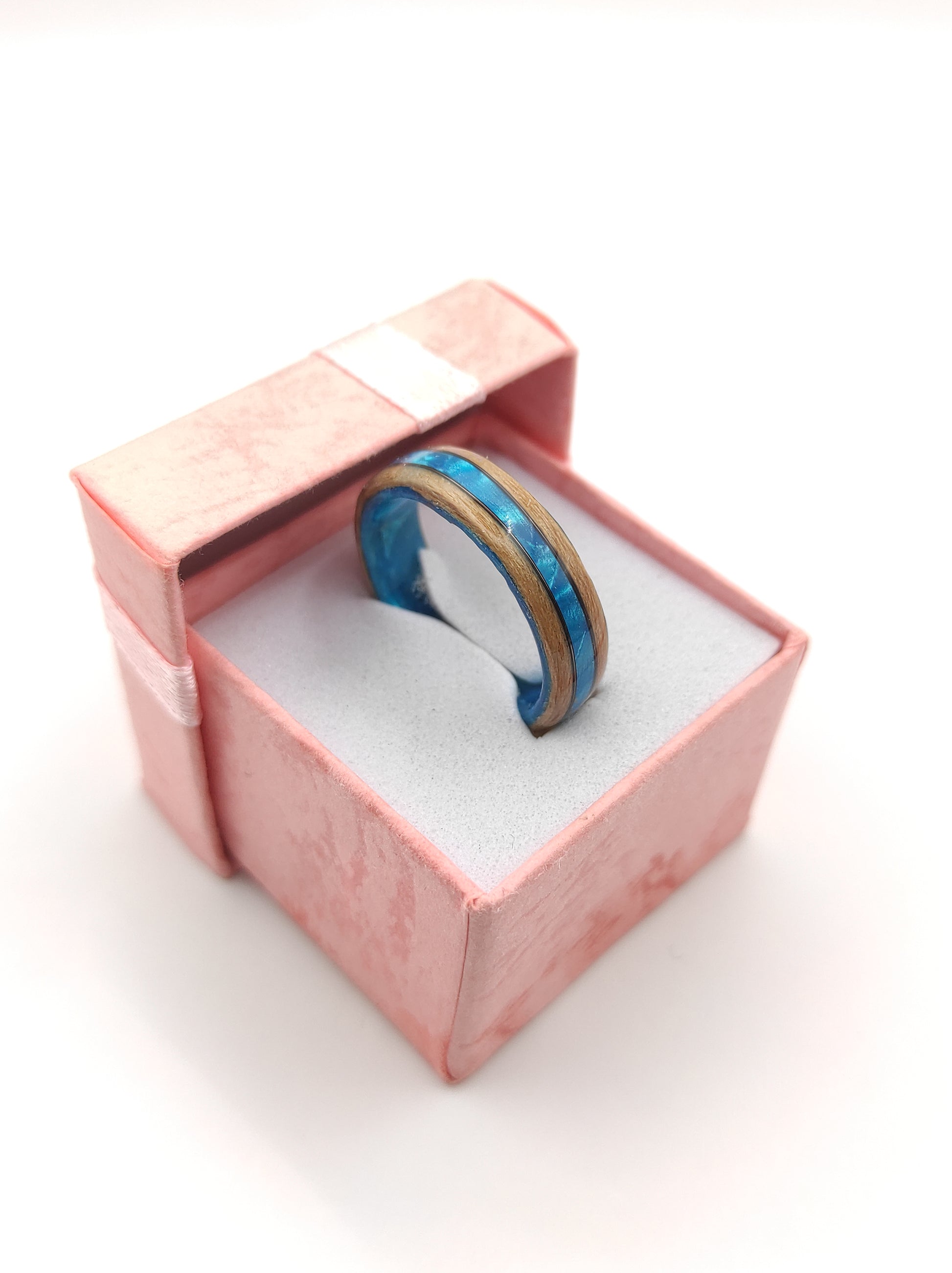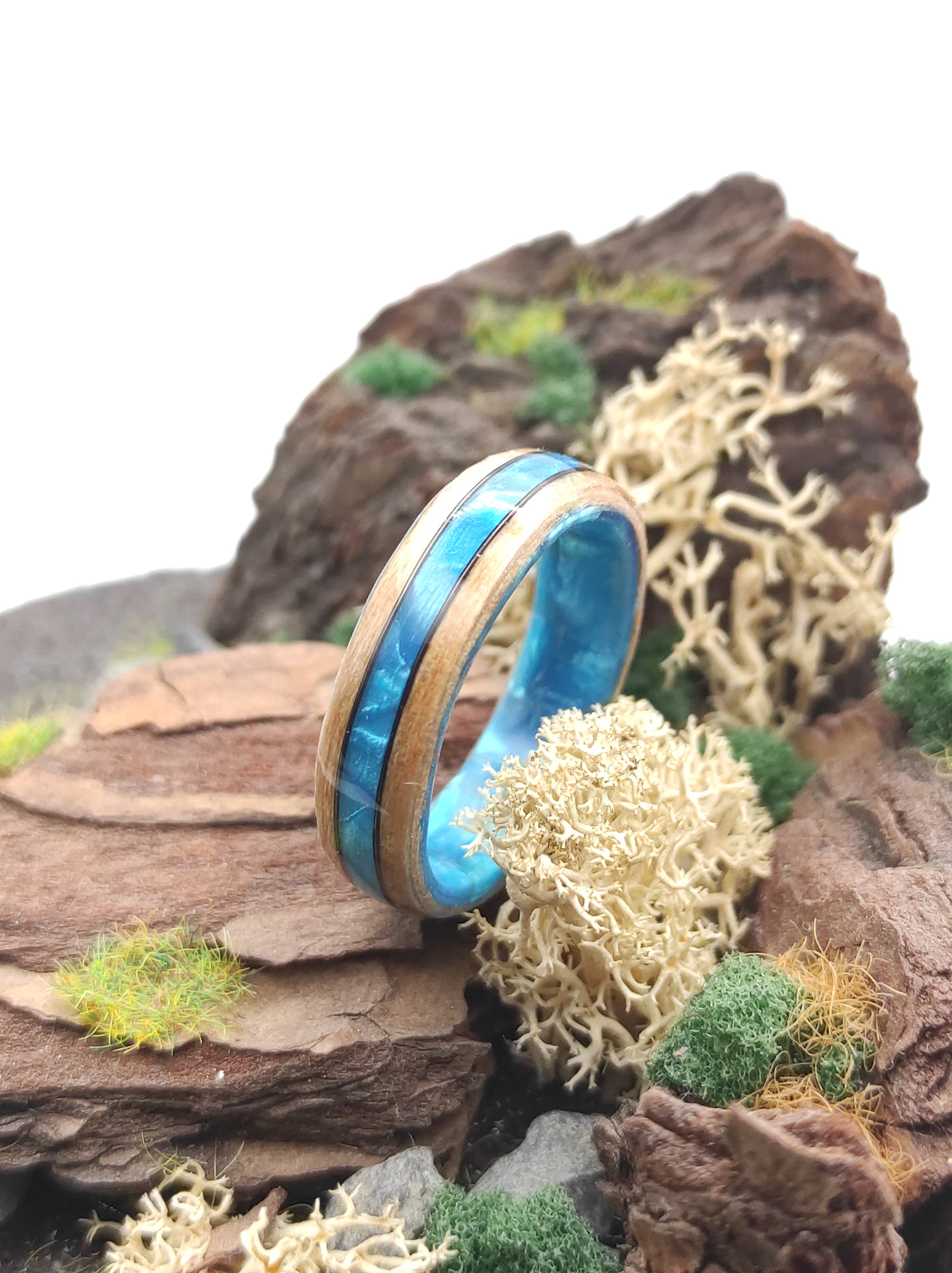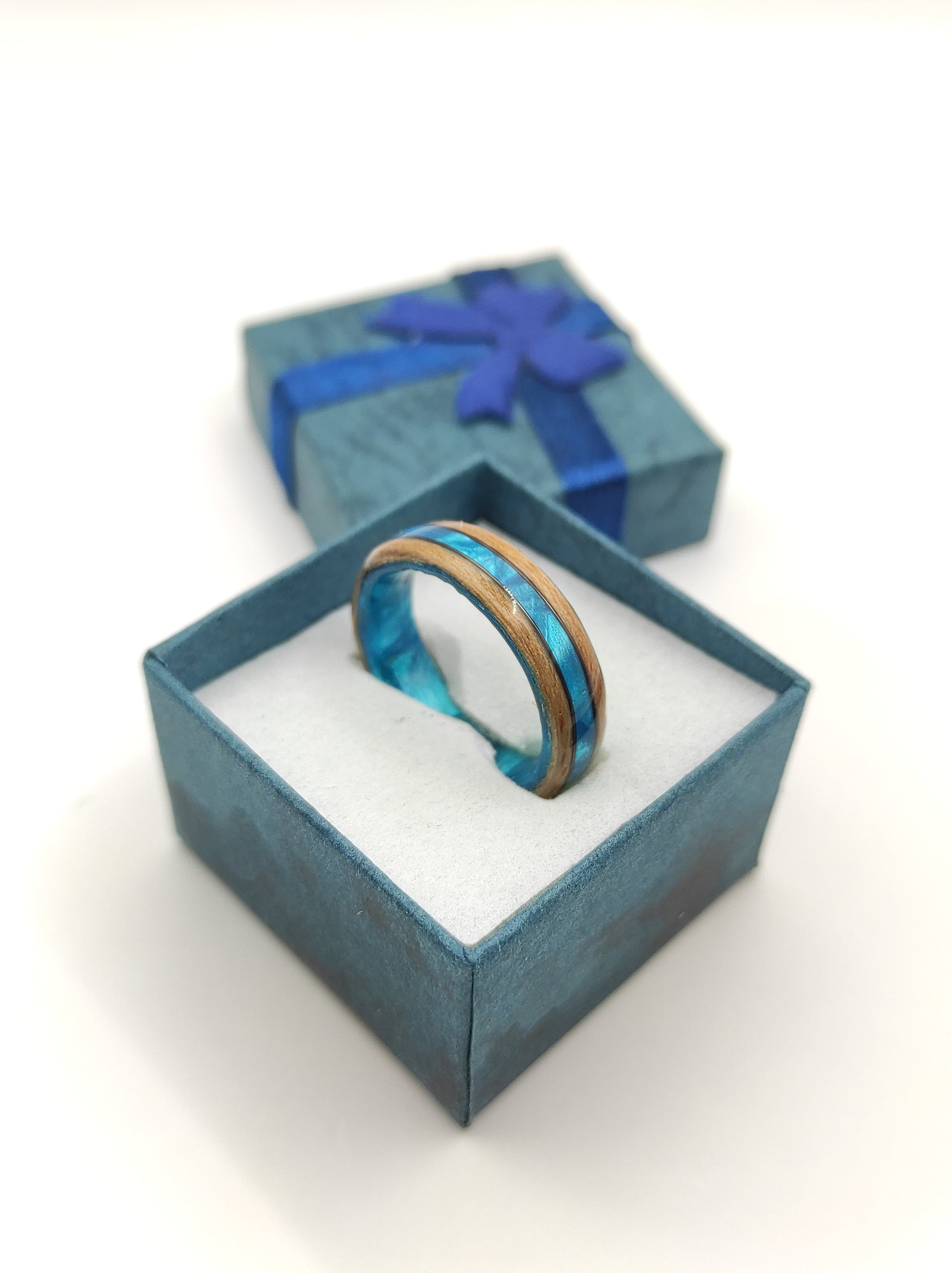 Zanurz się w kolorze błękitu — pierścionek Błękitna Przestrzeń to połączenie ciepła naturalnego drewna i głębi niebieskiego celuoidu.