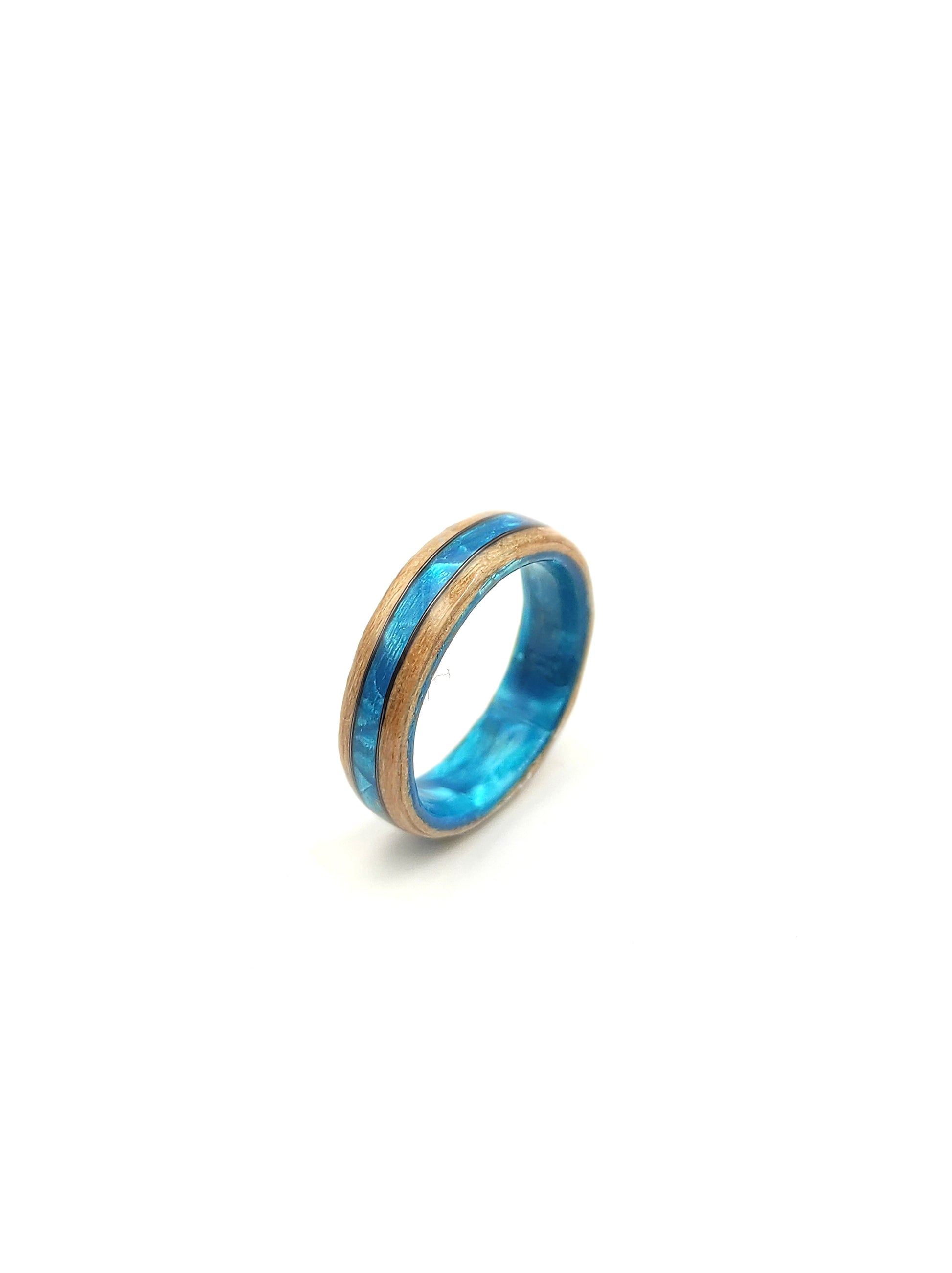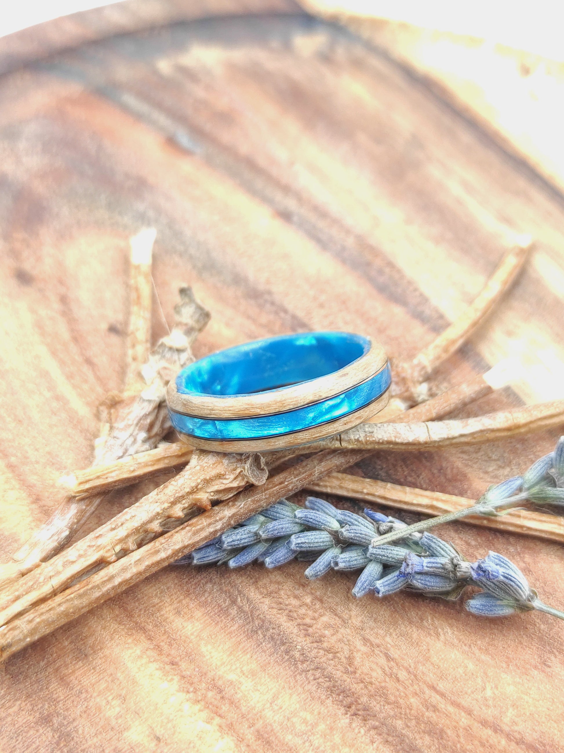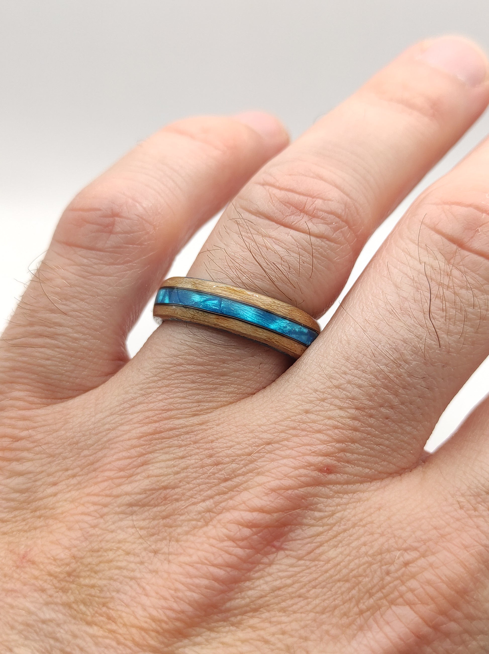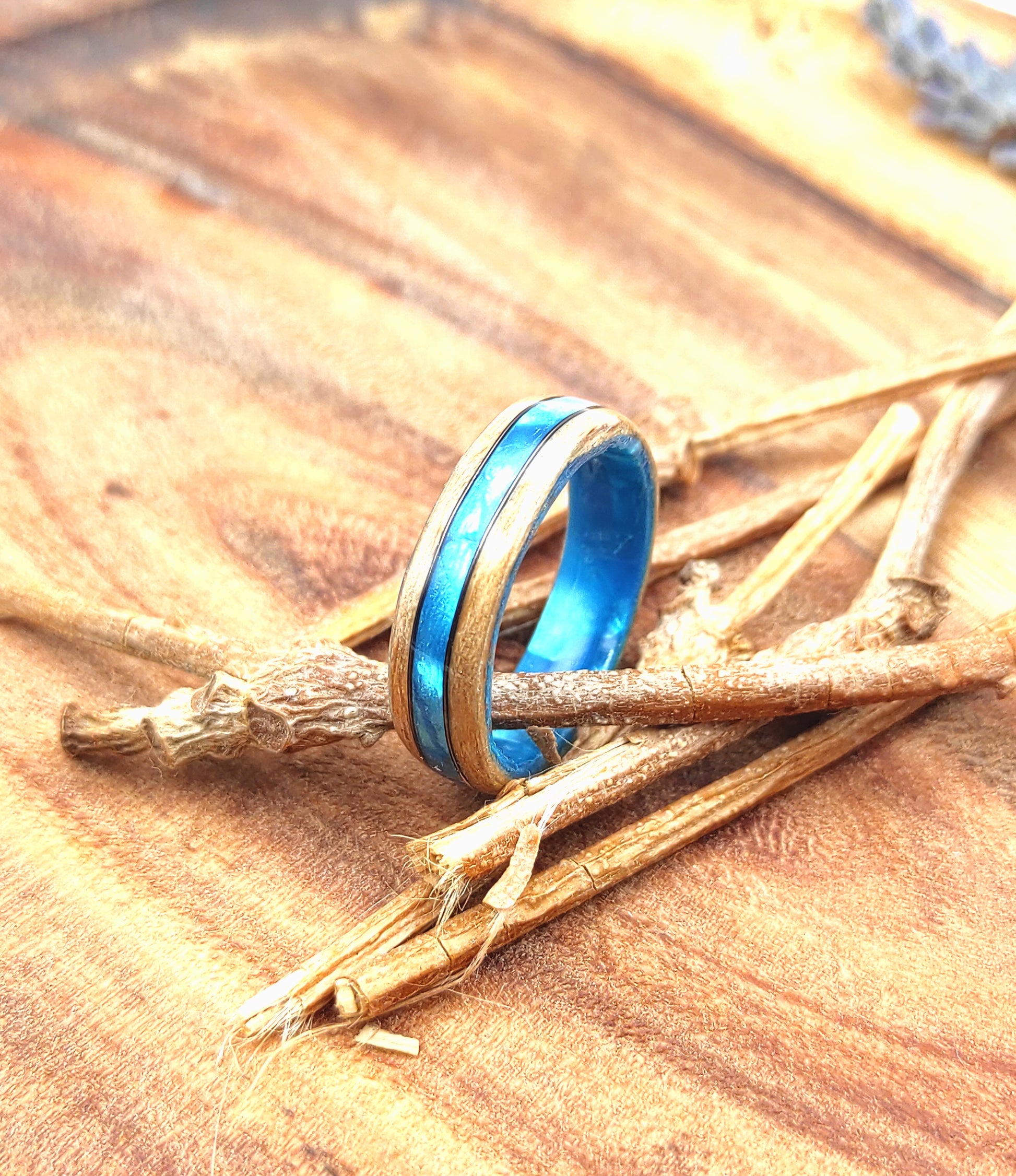 Zanurz się w kolorze błękitu — pierścionek Błękitna Przestrzeń to połączenie ciepła naturalnego drewna i głębi niebieskiego celuoidu.