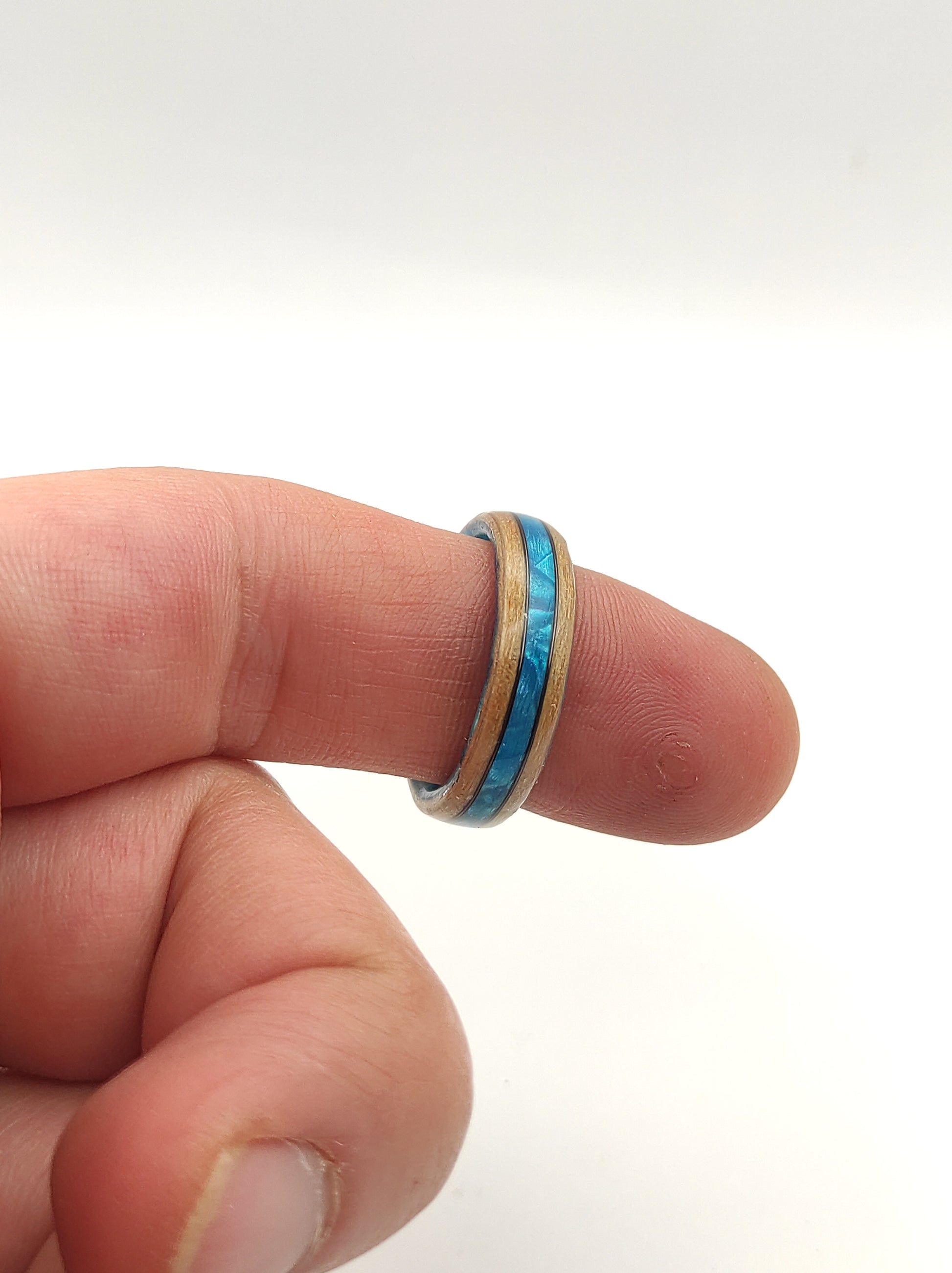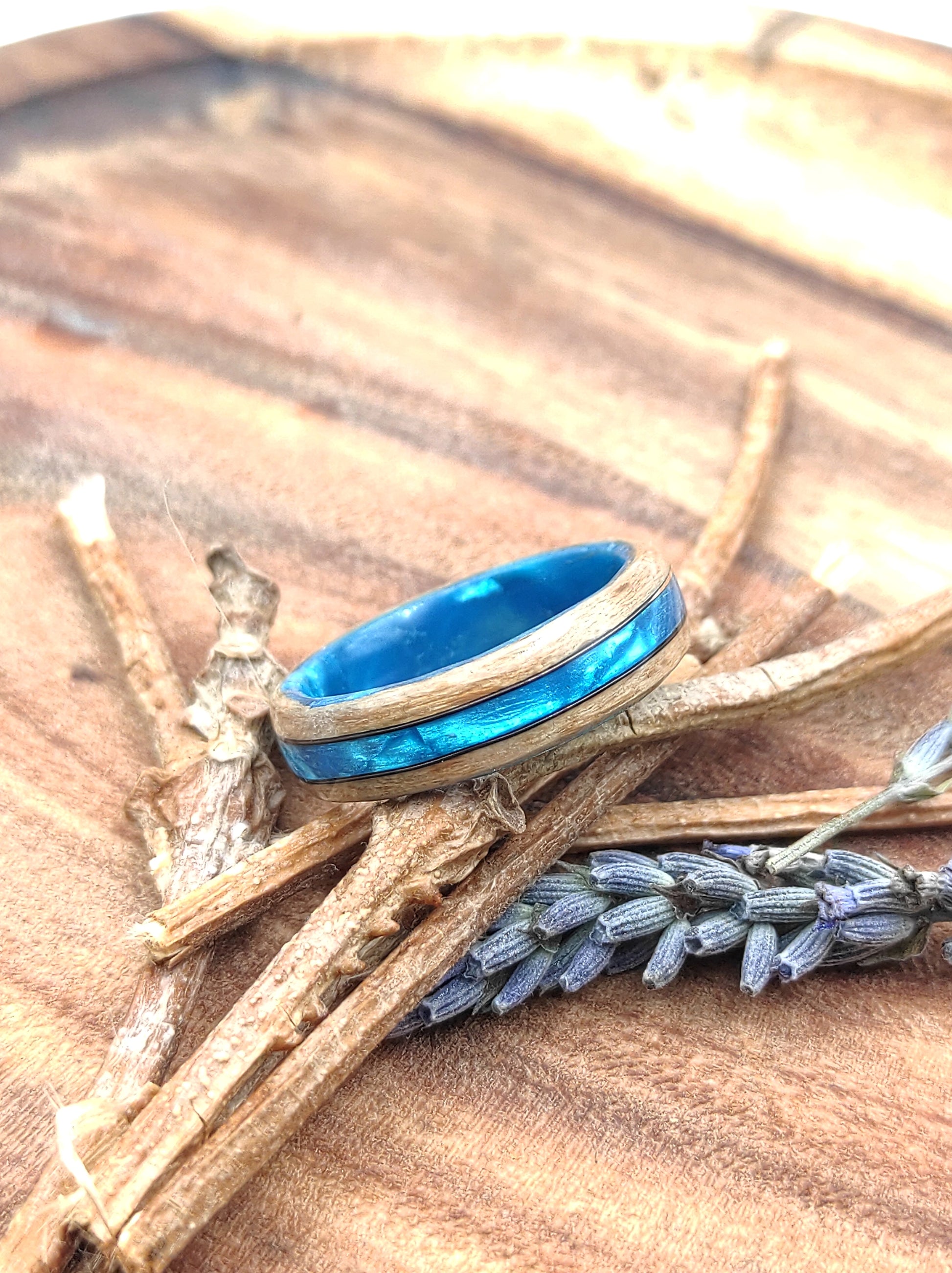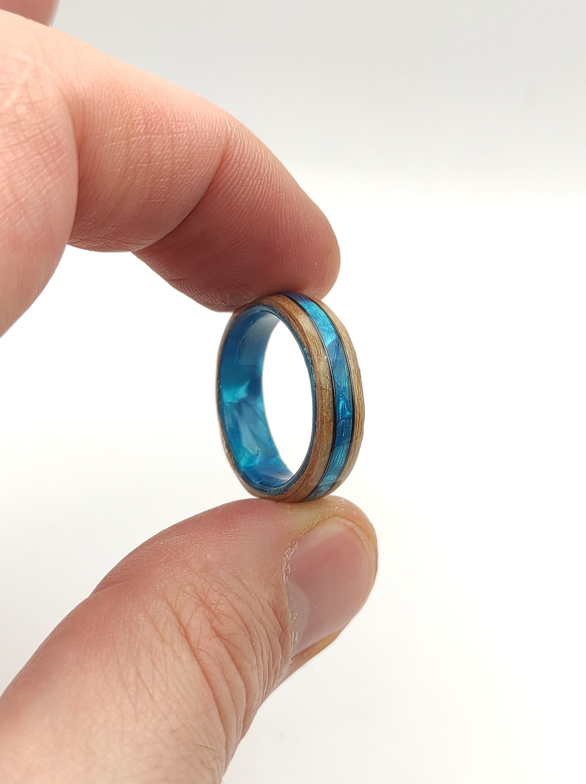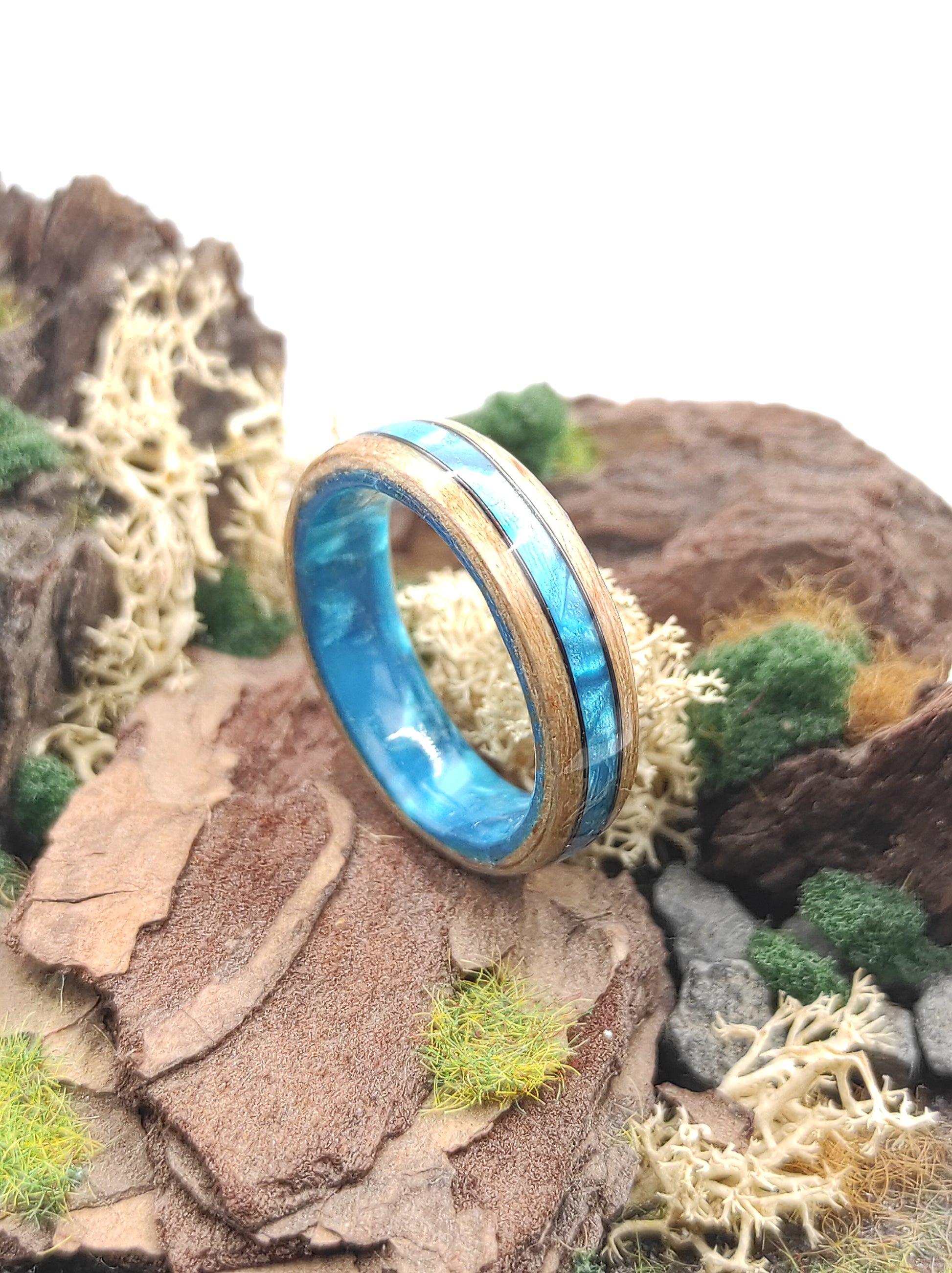 Zanurz się w kolorze błękitu — pierścionek Błękitna Przestrzeń to połączenie ciepła naturalnego drewna i głębi niebieskiego celuoidu.