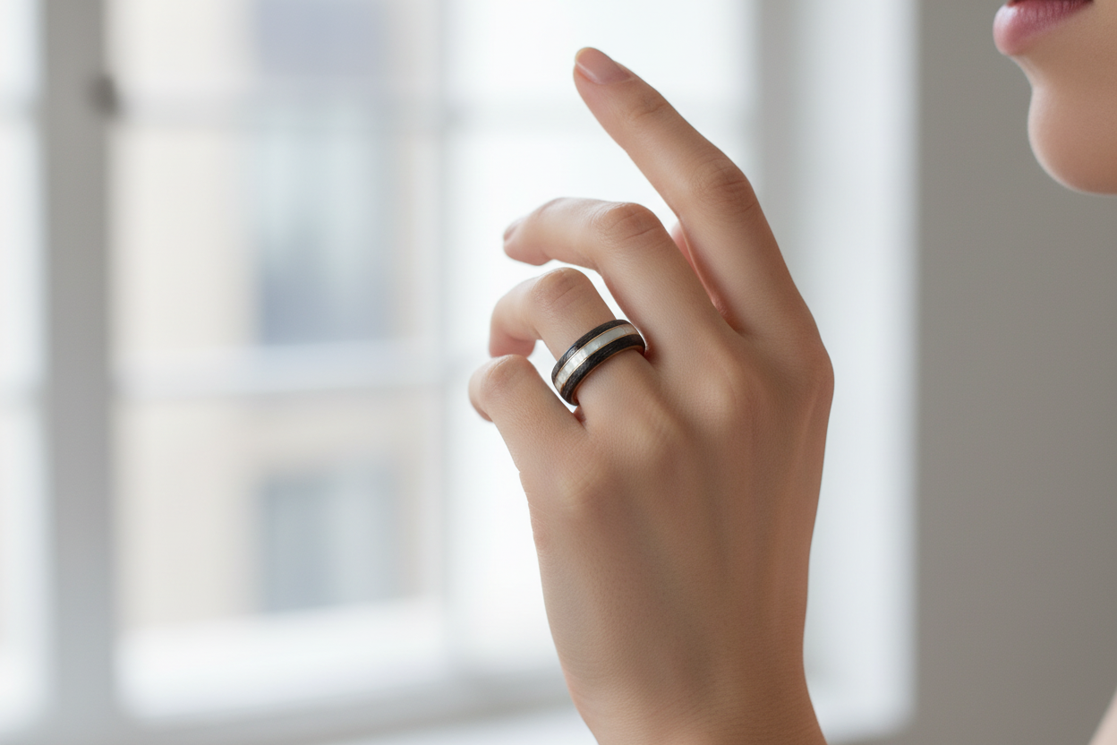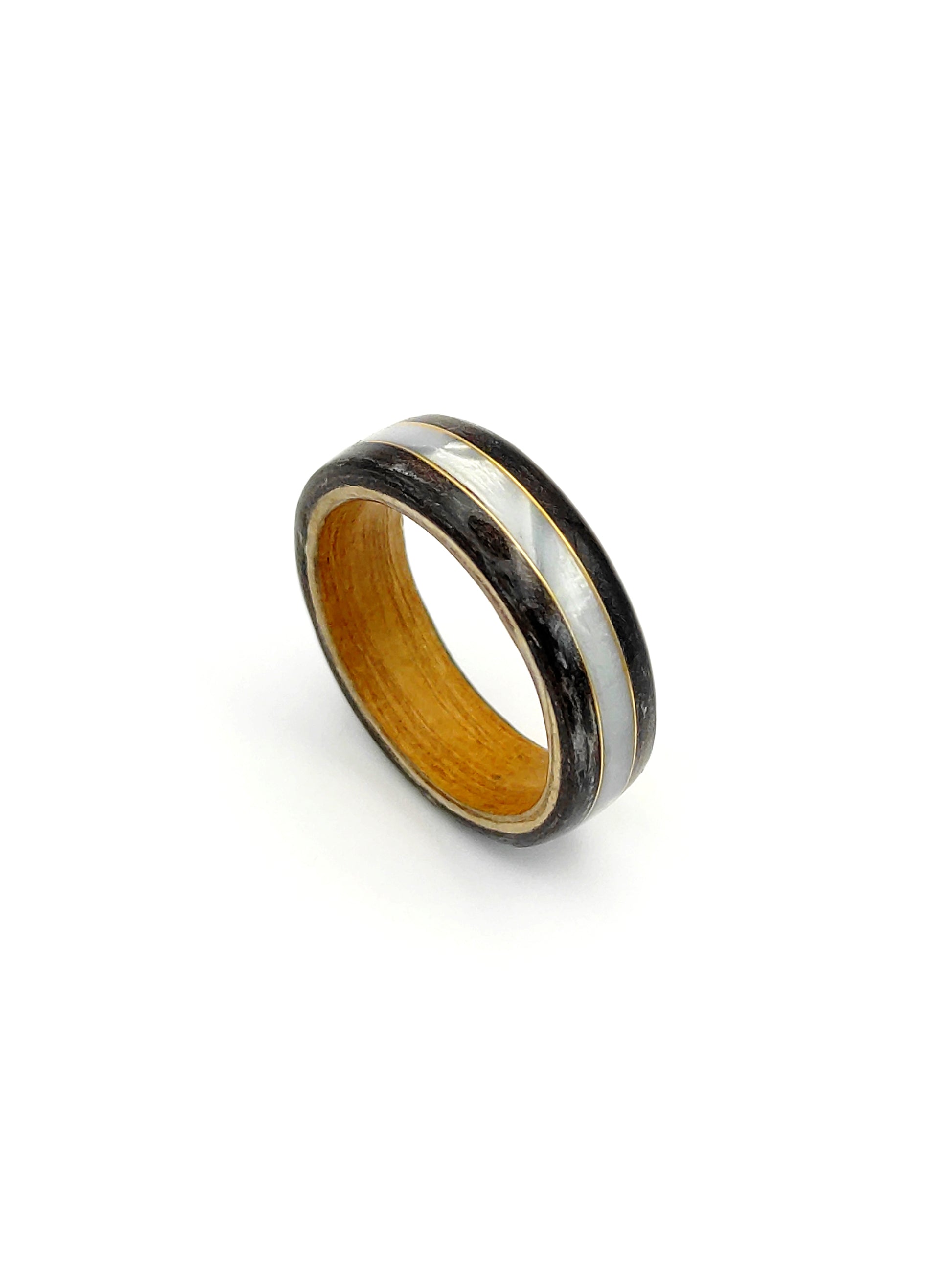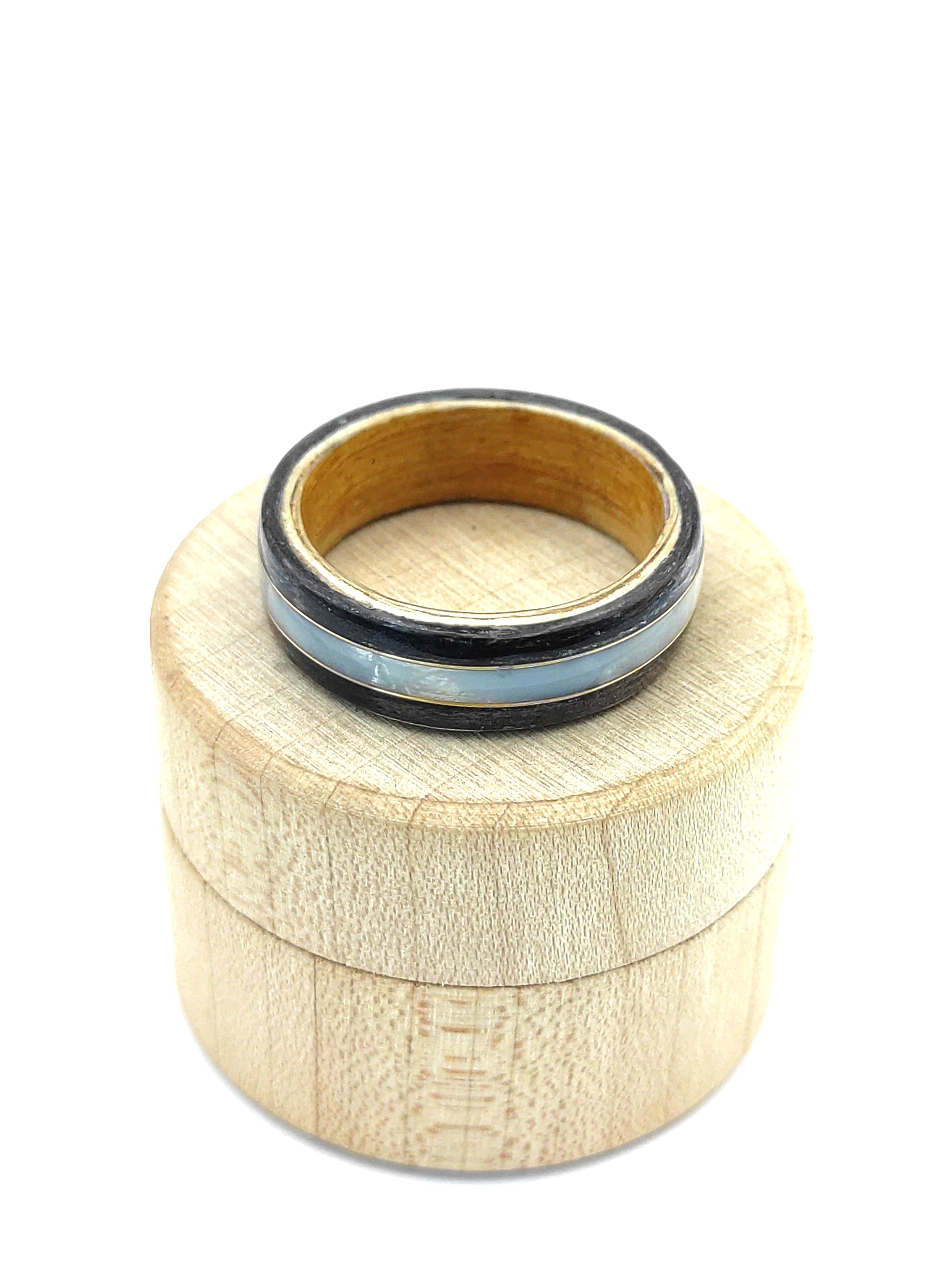 Centralnym elementem projektu jest wkładka z celuoidu w kolorze jasno perlistym. Jej subtelny połysk delikatnie zmienia się w zależności od kąta padania światła, dodając pierścionkowi głębi i elegancji. To detal, który wyróżnia ten model na tle klasycznych pierścionków drewnianych.