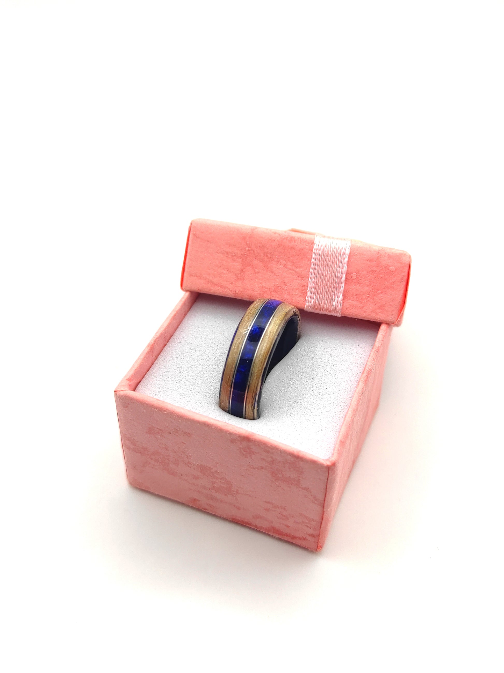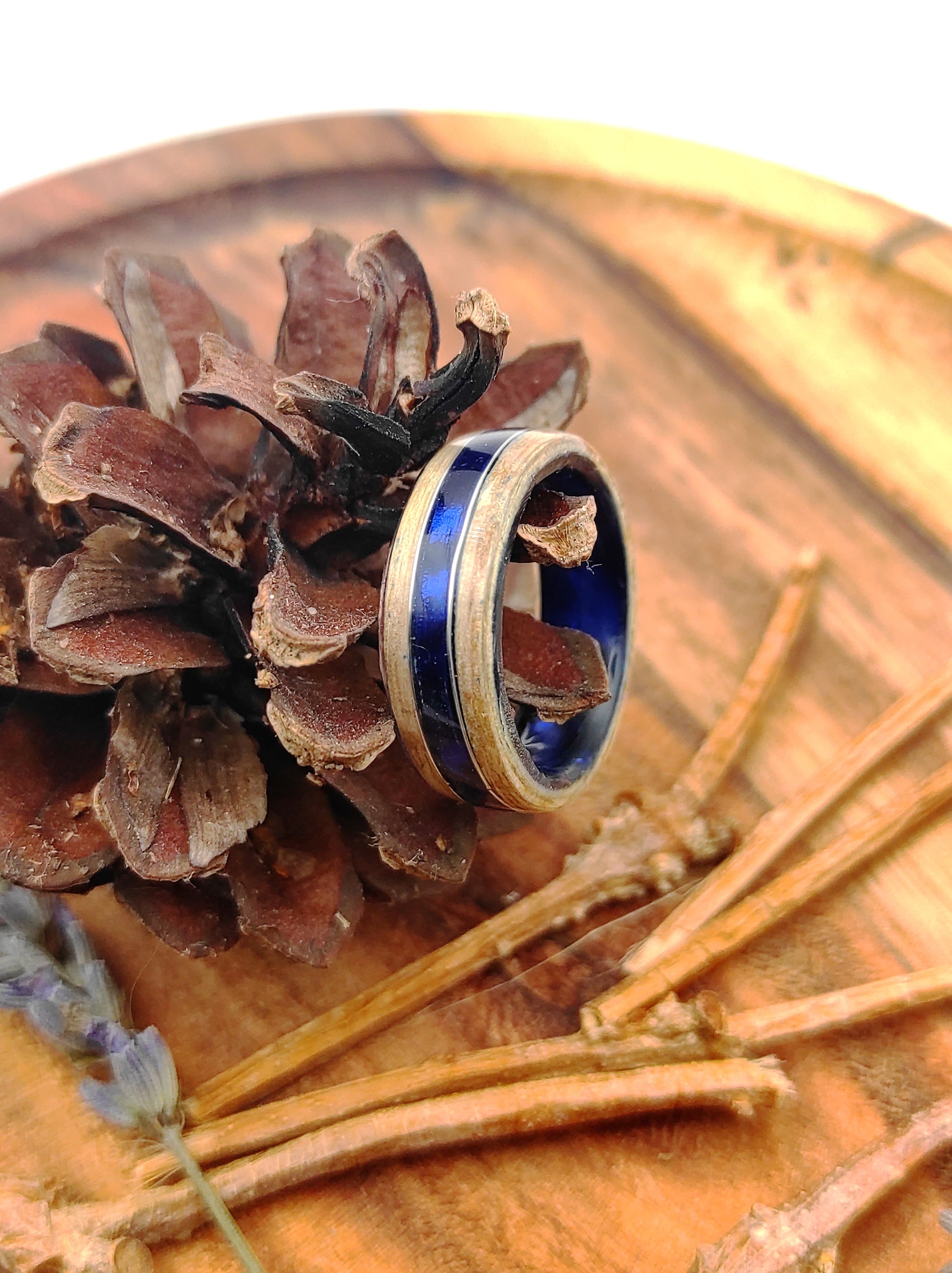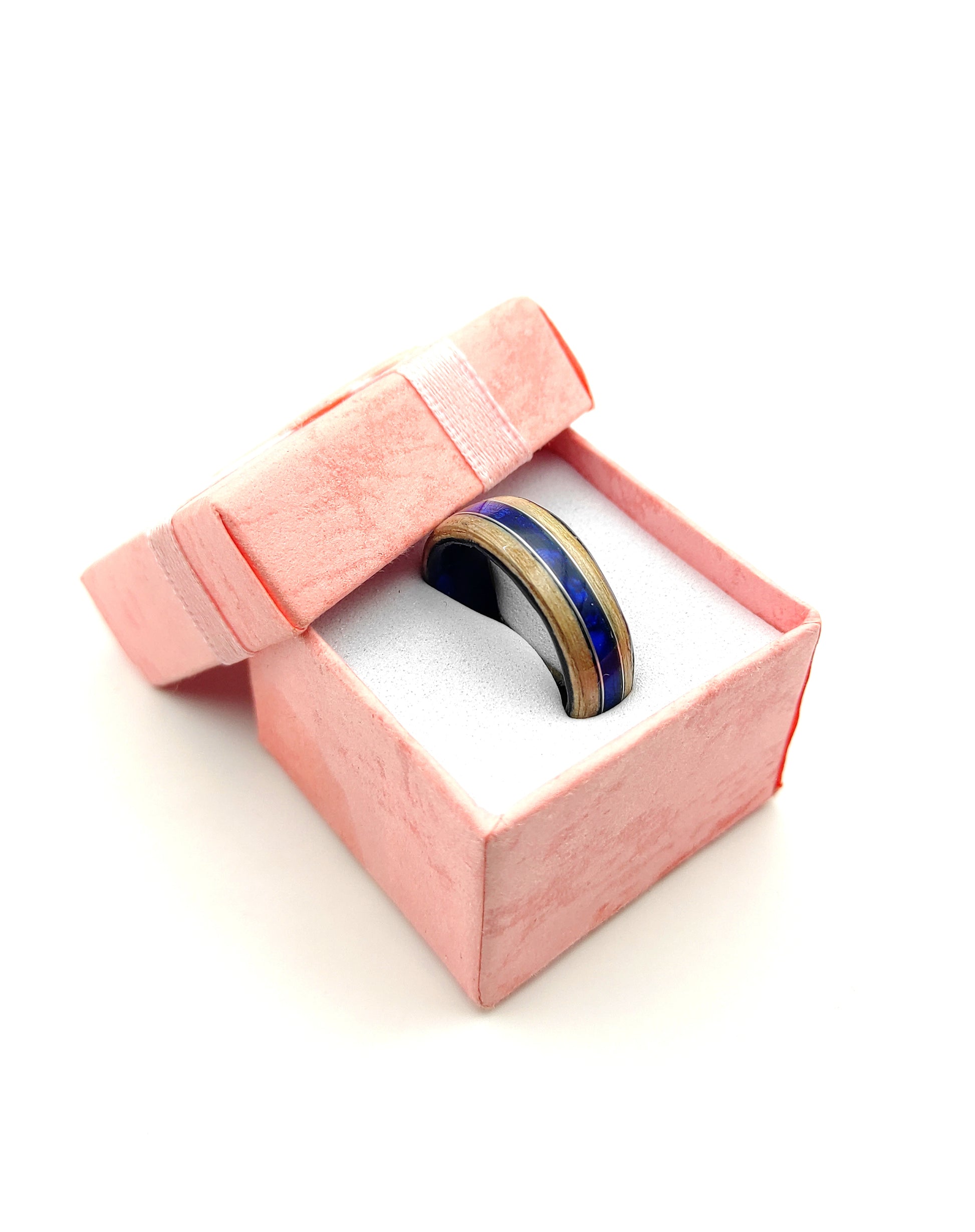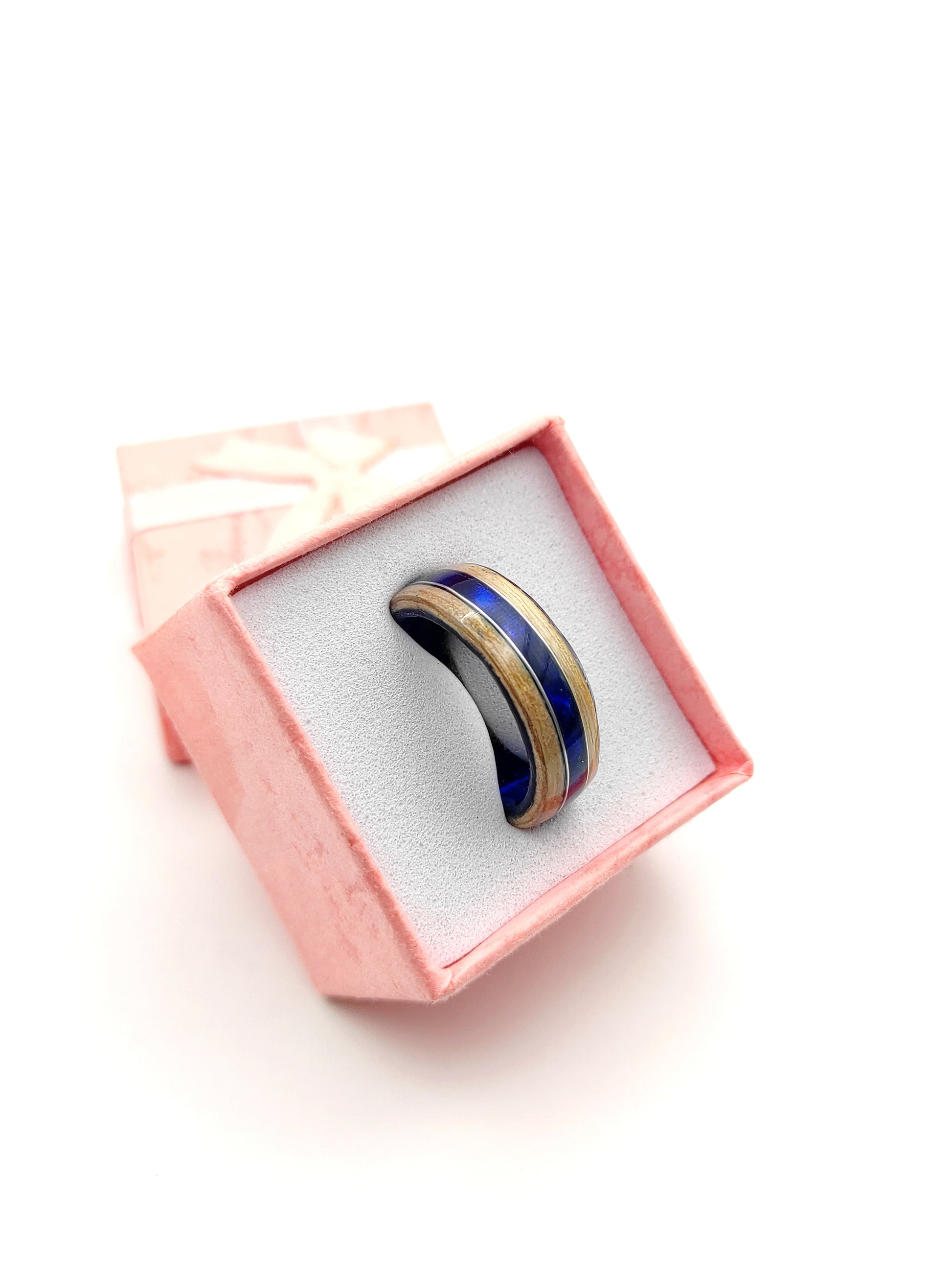 „Oceaniczny Szept” to unikalny pierścionek wykonany ręcznie z naturalnego forniru jesionowego oraz ciemnoniebieskiego celuloidu. Inspirowany spokojem morskich fal i naturalnym rytmem przyrody, symbolizuje harmonię między żywiołem wody i ziemi.
