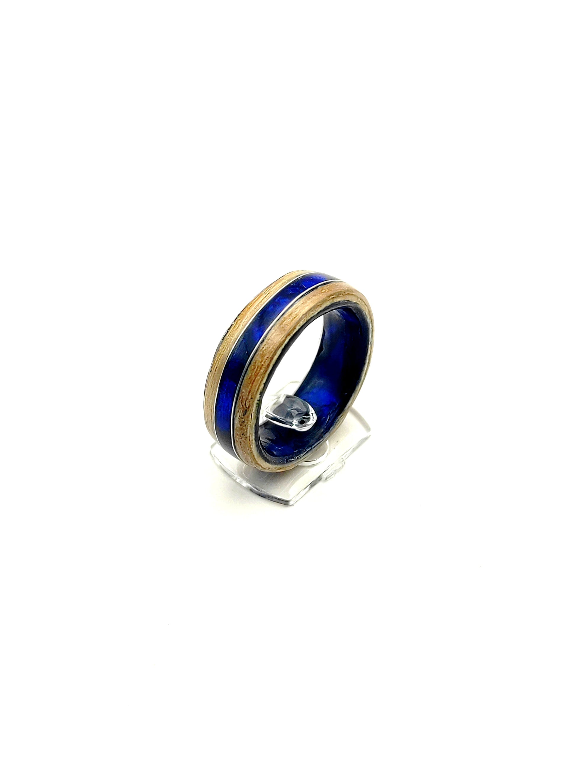 Oceaniczny Szept – pierścionek z drewna jesionu i ciemnoniebieskiego celuoidu