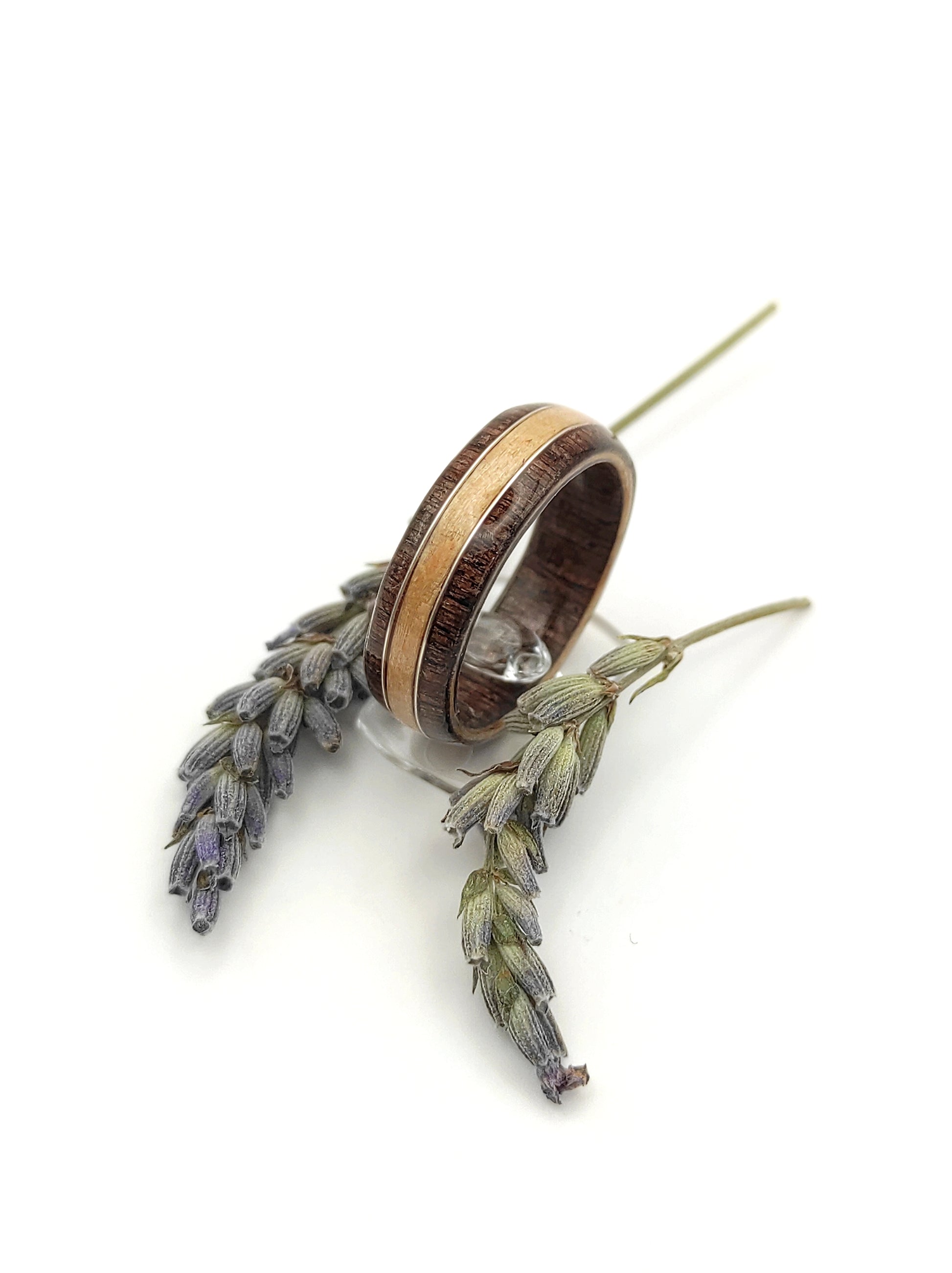 Ten pierścionek drewniany z buku i wenge to połączenie naturalnych fornirów o wyraźnym kontraście kolorystycznym. Jasny buk zestawiony został z ciemnym, głębokim wenge, a całość podkreśla subtelny dekoracyjny stalowy drucik, który nadaje pierścionkowi nowoczesny i minimalistyczny charakter.