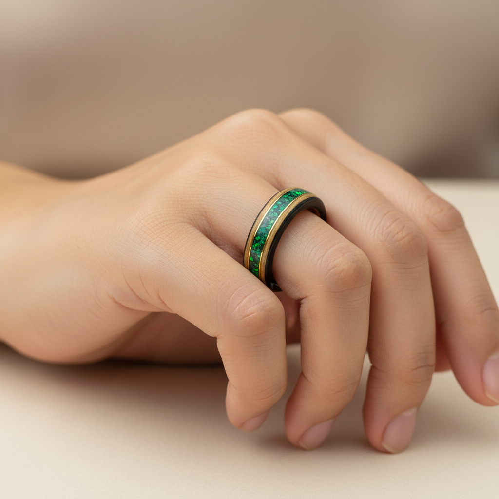 Sercem tego projektu jest zielona opalowa inkrustacja, która mieni się w zależności od światła odcieniami szmaragdu, turkusu i głębokiej zieleni. Opal symbolizuje nadzieję, kreatywność i emocjonalną równowagę. W połączeniu z drewnem staje się metaforą balansu między naturą a duchowością. Subtelne drobinki opalu dodają blasku i głębi, czyniąc każdy pierścionek wyjątkowym dziełem sztuki.