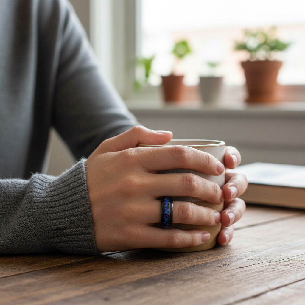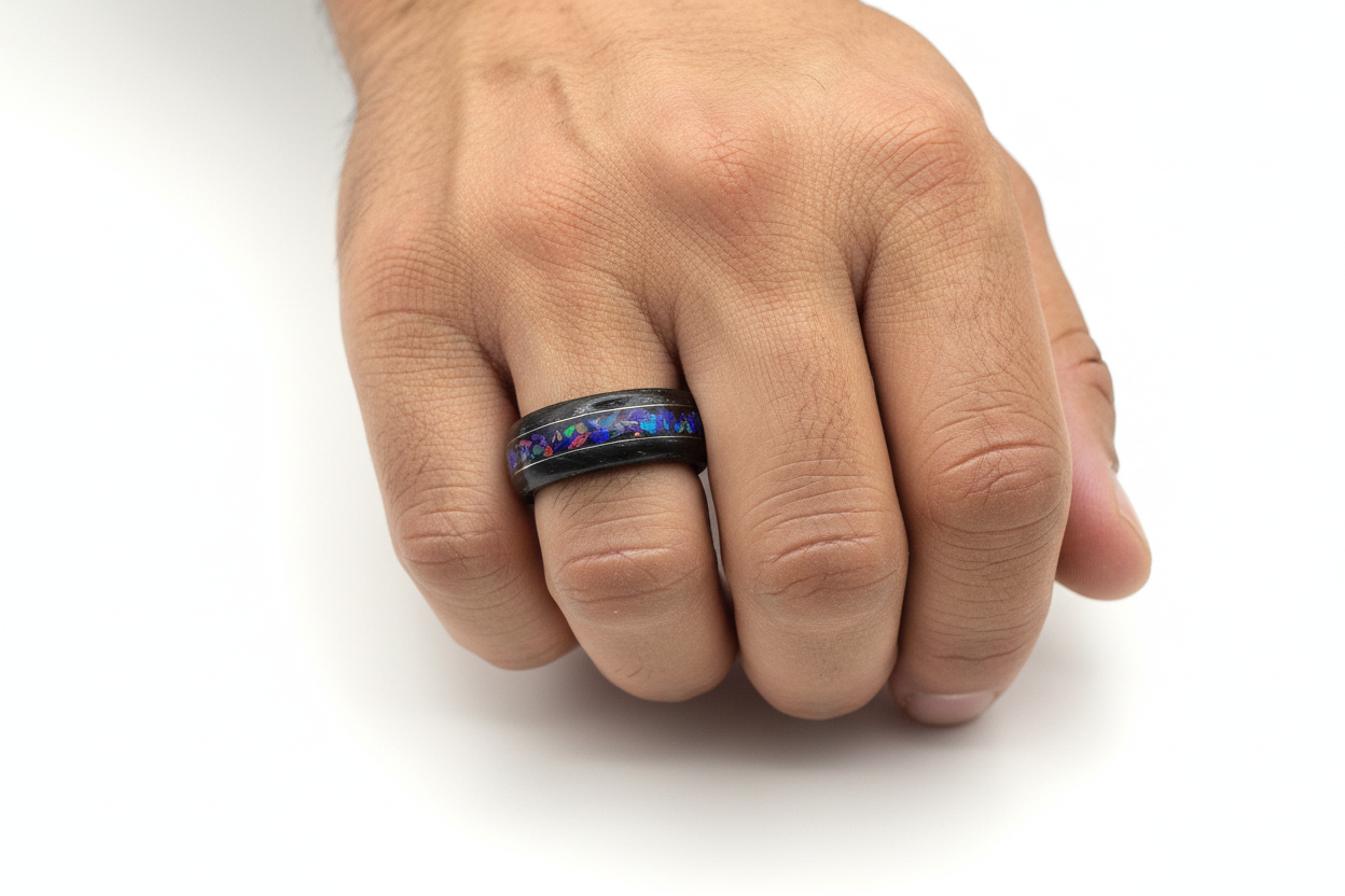Dąb czarno-srebrny tworzy mocne, eleganckie tło dla kruszonego opalu Midnight. W zależności od kąta światła pierścionek zmienia charakter — od minimalistycznej, ciemnej obrączki po dynamiczny, kolorowy akcent przyciągający wzrok.
