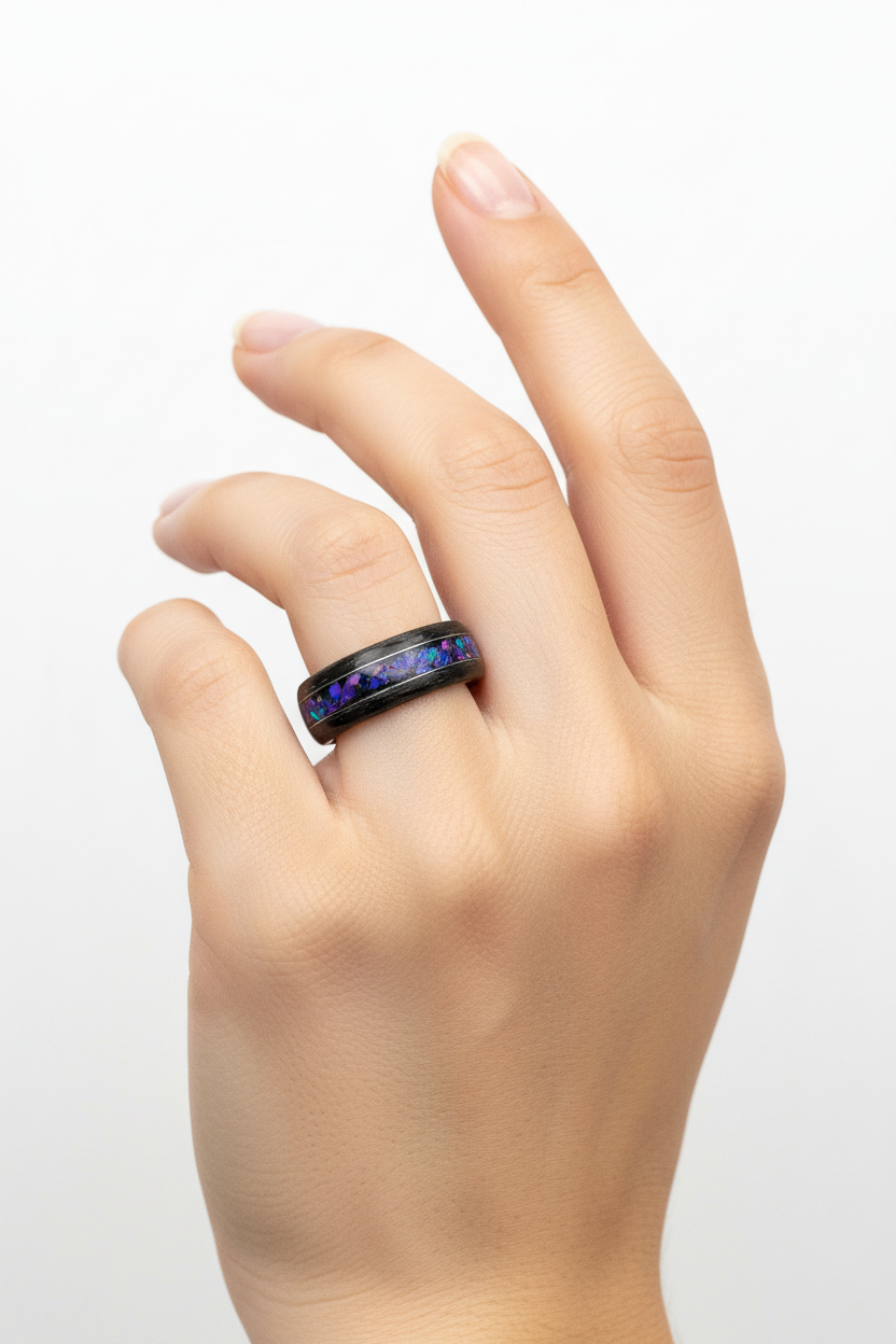 Ten pierścionek drewniany z opalem Midnight łączy głęboką, niemal czarną bazę z chłodnymi srebrzystymi refleksami i pasem opalu, który w świetle rozbłyska granatem, fioletem oraz subtelną czerwienią.