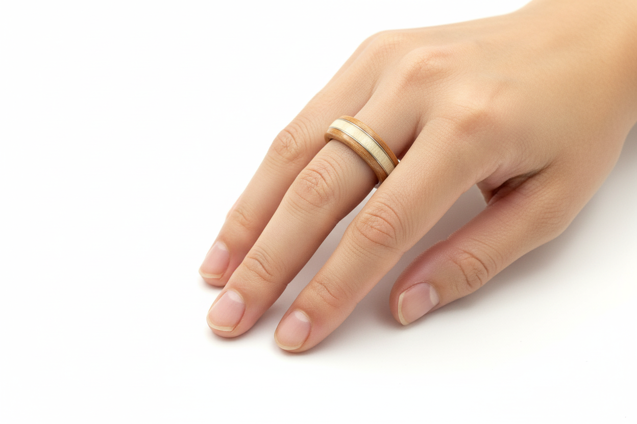 Centralna wkładka z klonu tworzy jasny pas przechodzący przez środek obrączki. Wstawka z klonu jest lekko falowana, dzięki czemu linia podziału nie jest idealnie prosta, lecz subtelnie organiczna. To detal, który nadaje całości naturalnej dynamiki i sprawia, że pierścionek nie wygląda technicznie ani geometrycznie.