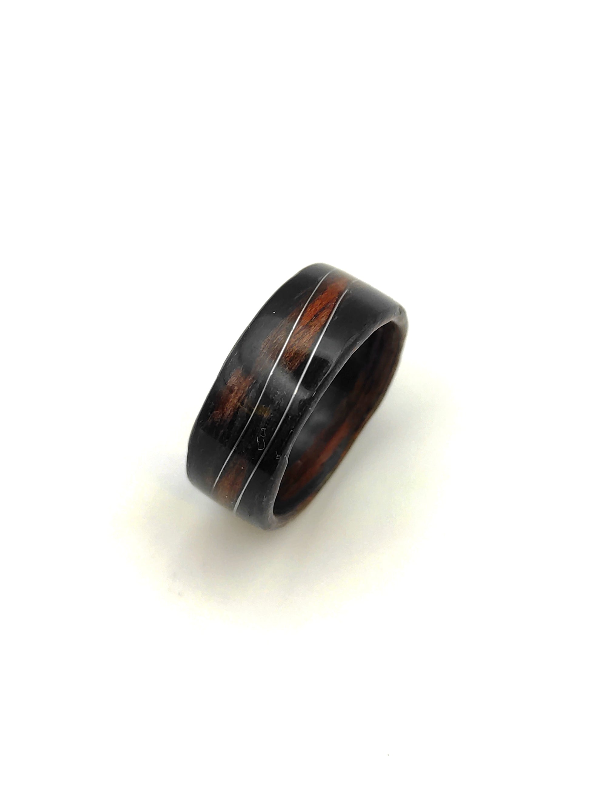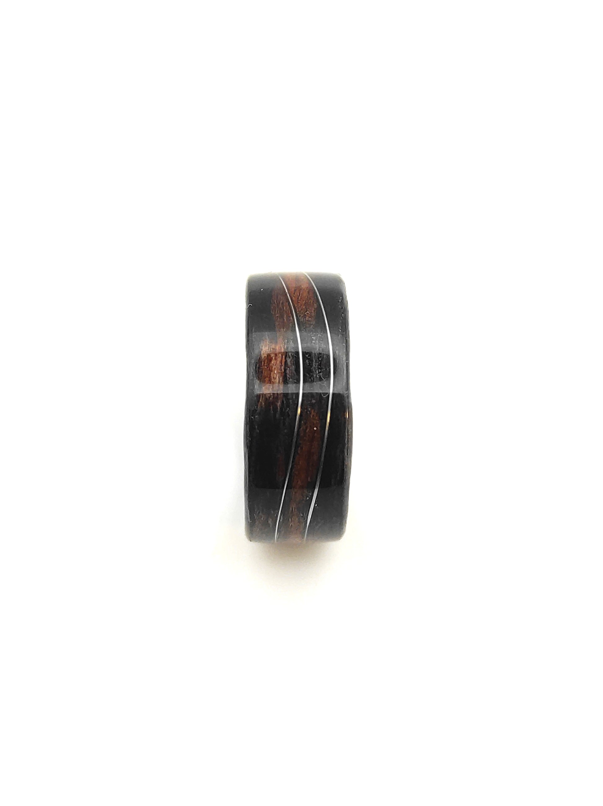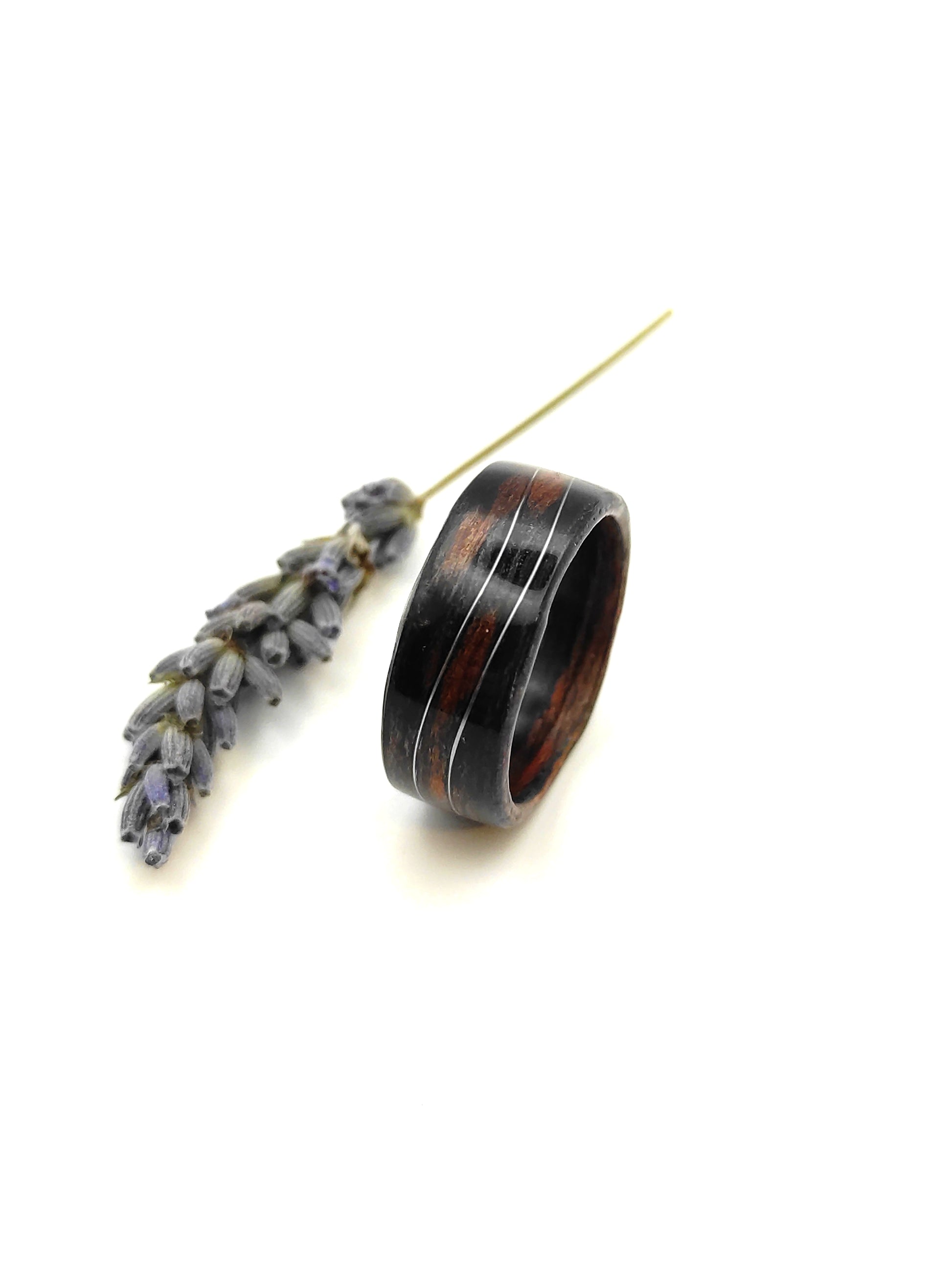 Ten pierścionek z hebanu jest właśnie takim modelem. Ciężko go pomylić z czymkolwiek innym: głęboka, naturalna czerń drewna i delikatna fala z drucika w kolorze srebrnym tworzą połączenie, które wygląda jednocześnie nowocześnie i ponadczasowo.