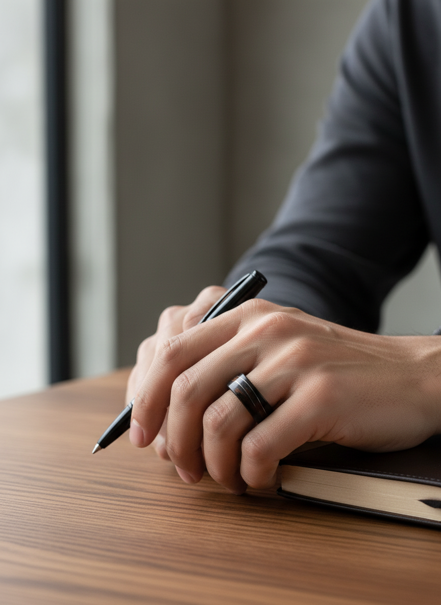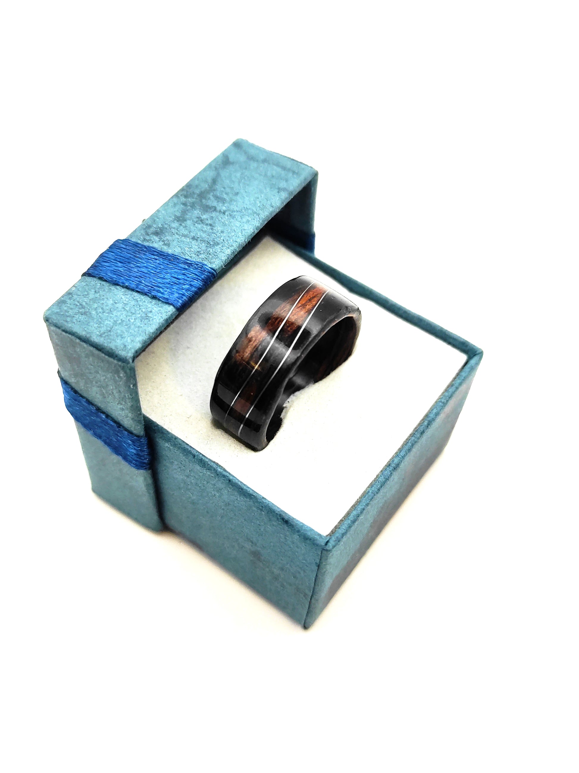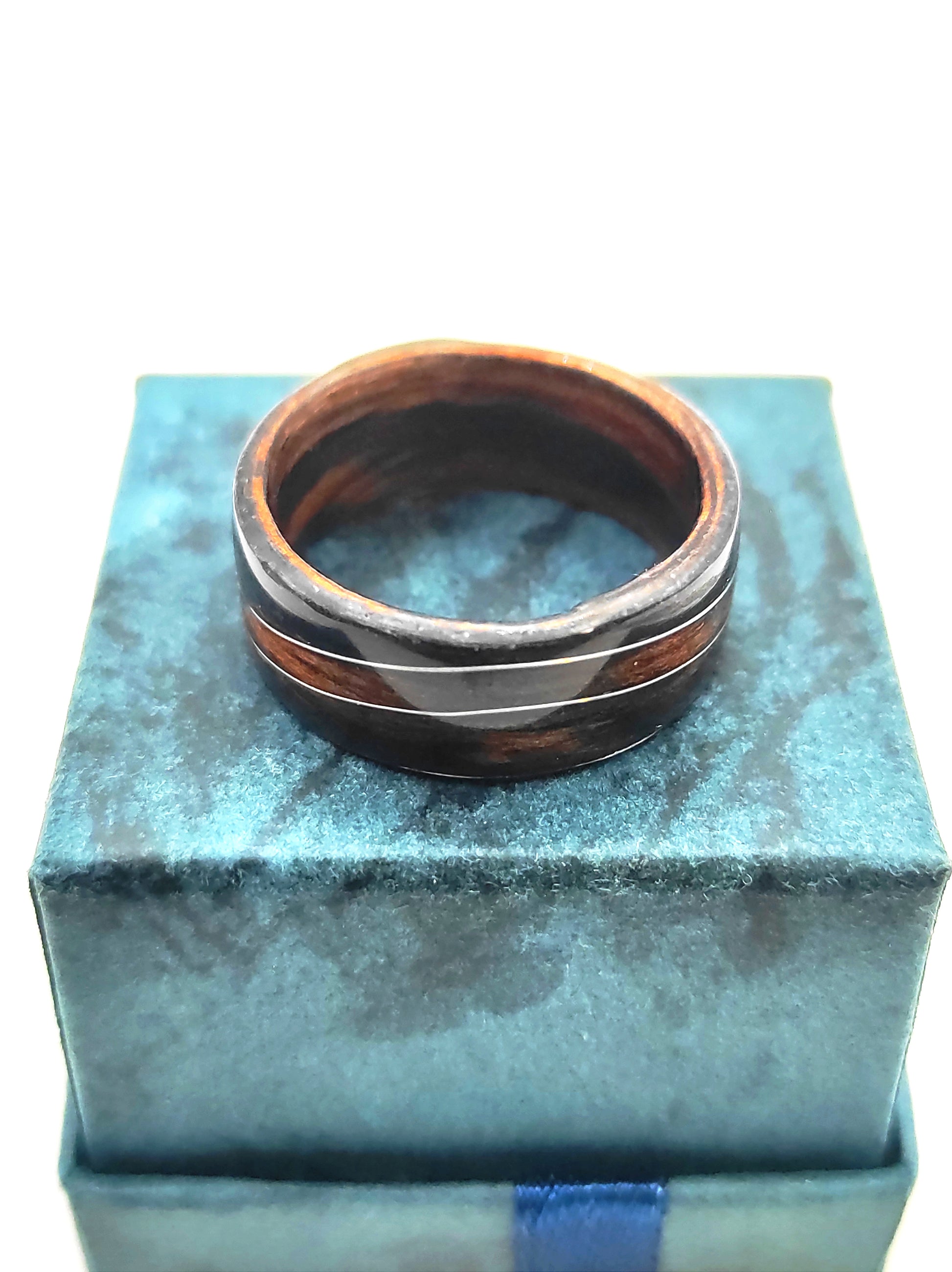 Ten pierścionek z hebanu jest właśnie takim modelem. Ciężko go pomylić z czymkolwiek innym: głęboka, naturalna czerń drewna i delikatna fala z drucika w kolorze srebrnym tworzą połączenie, które wygląda jednocześnie nowocześnie i ponadczasowo.