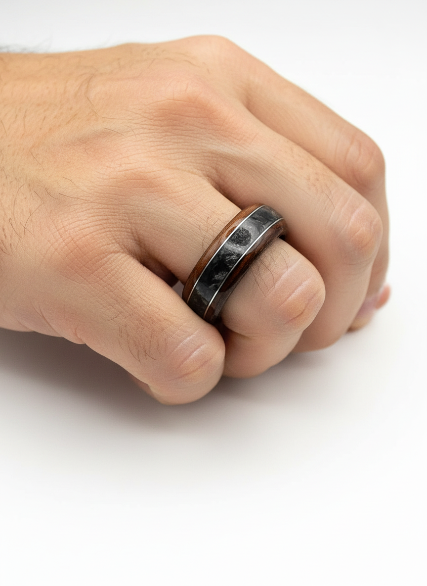 Podstawą pierścionka jest ciemne drewno, które samo w sobie ma niesamowity, organiczny wzór. Rysunek słojów potrafi układać się w delikatne fale, drobne pęknięcia, zawirowania i kontrasty, które sprawiają, że każdy model jest absolutnie unikalny. To nie jest materiał, który można powielić — każde cięcie odsłania coś innego, a Ty dostajesz dokładnie ten jeden, wyjątkowy fragment.