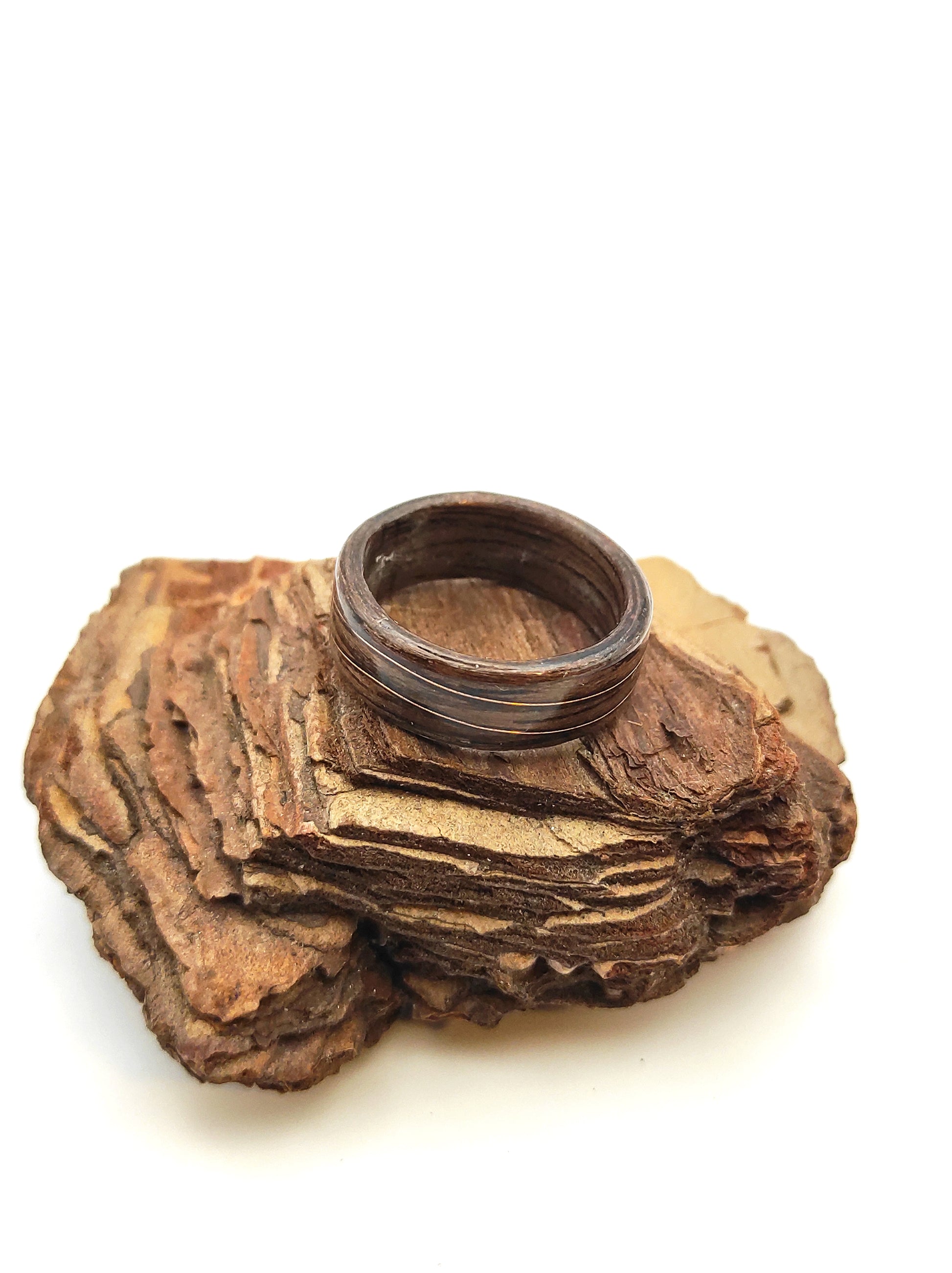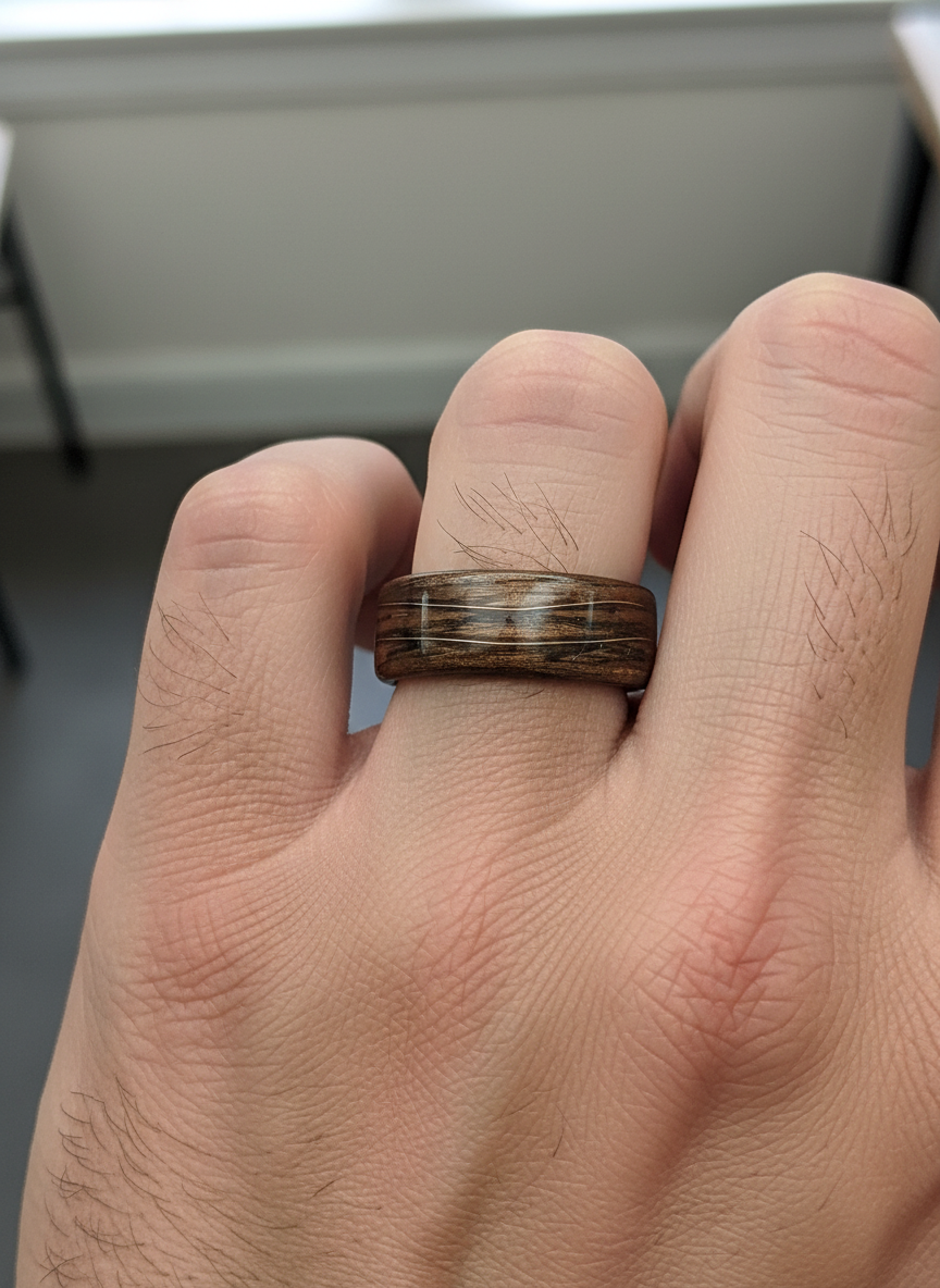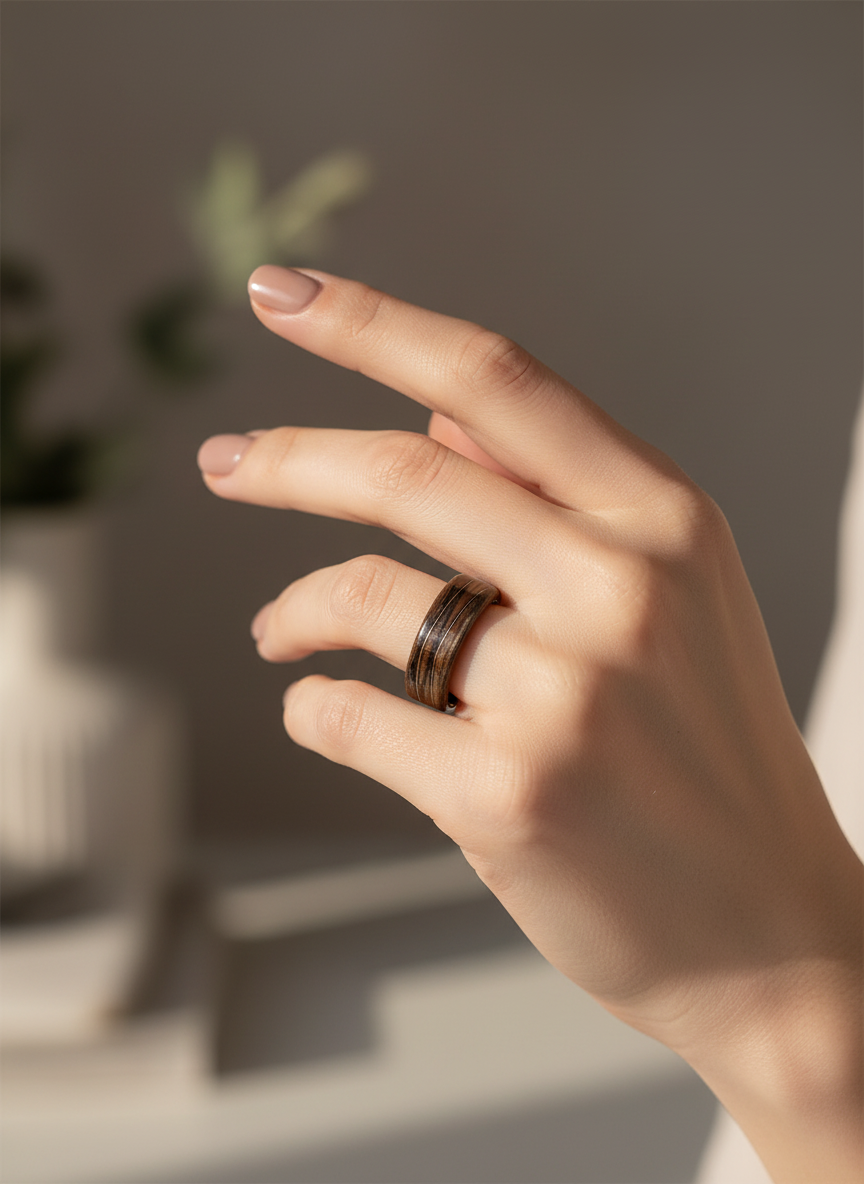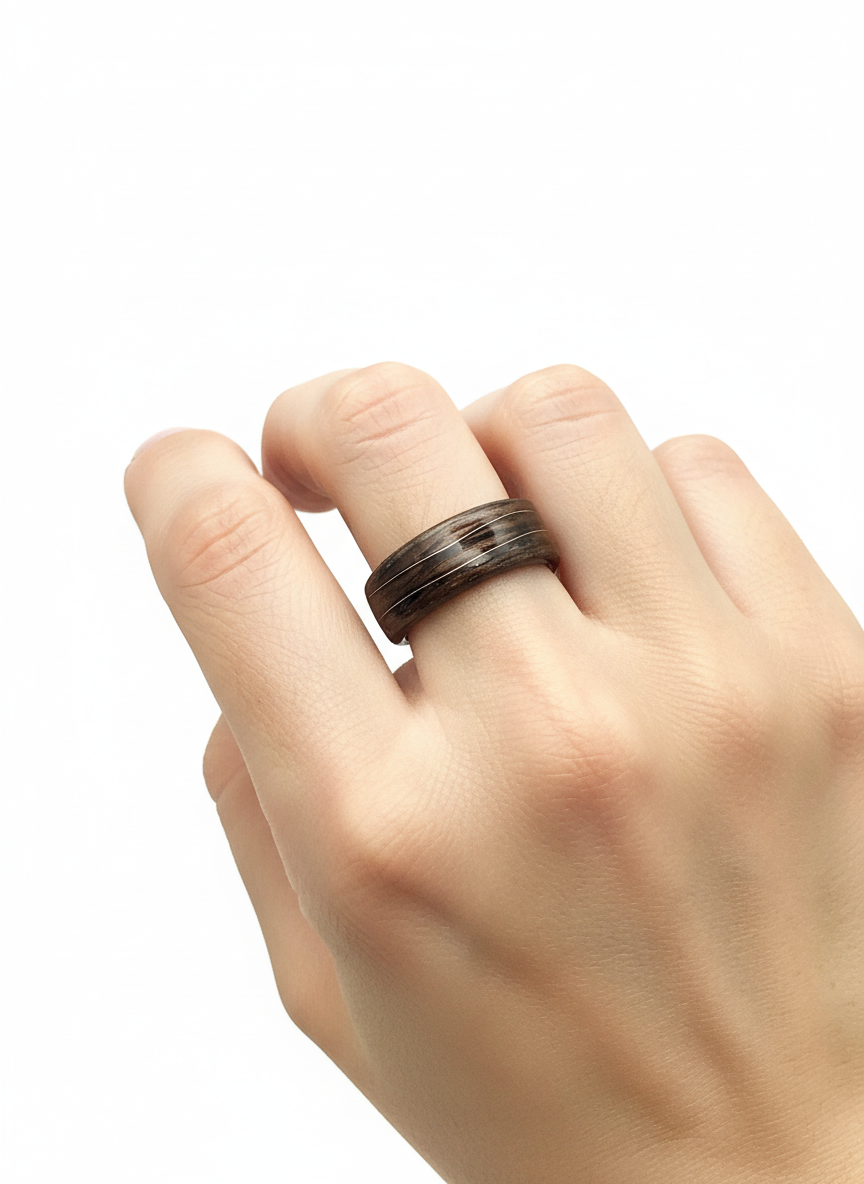 Ten pierścionek powstał z jednego z najbardziej charakterystycznych gatunków drewna – orzecha, który od wieków kojarzony jest z elegancją, ciepłem i szlachetnym wykończeniem. Jego głęboki, brązowy kolor z naturalnymi przejściami tonów sprawia, że każdy egzemplarz ma swój unikalny „rys”. Nie ma dwóch identycznych układów słojów, dlatego każdy pierścionek jest jedyny w swoim rodzaju.
