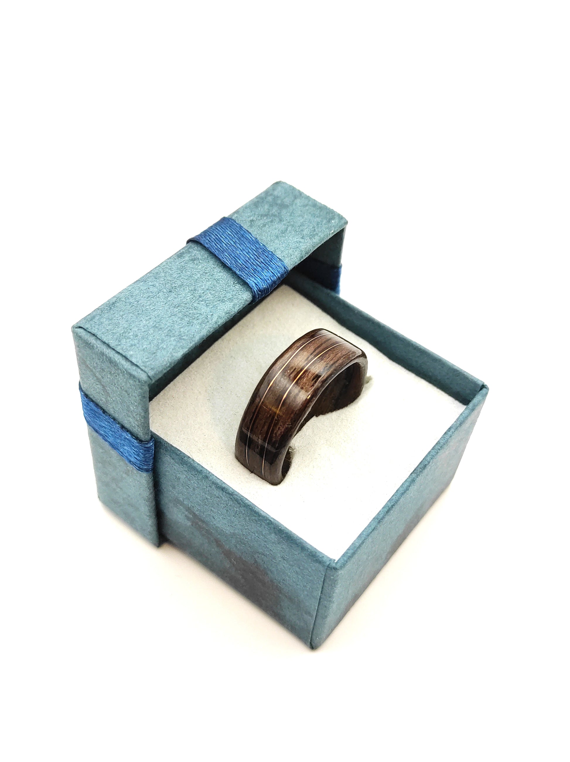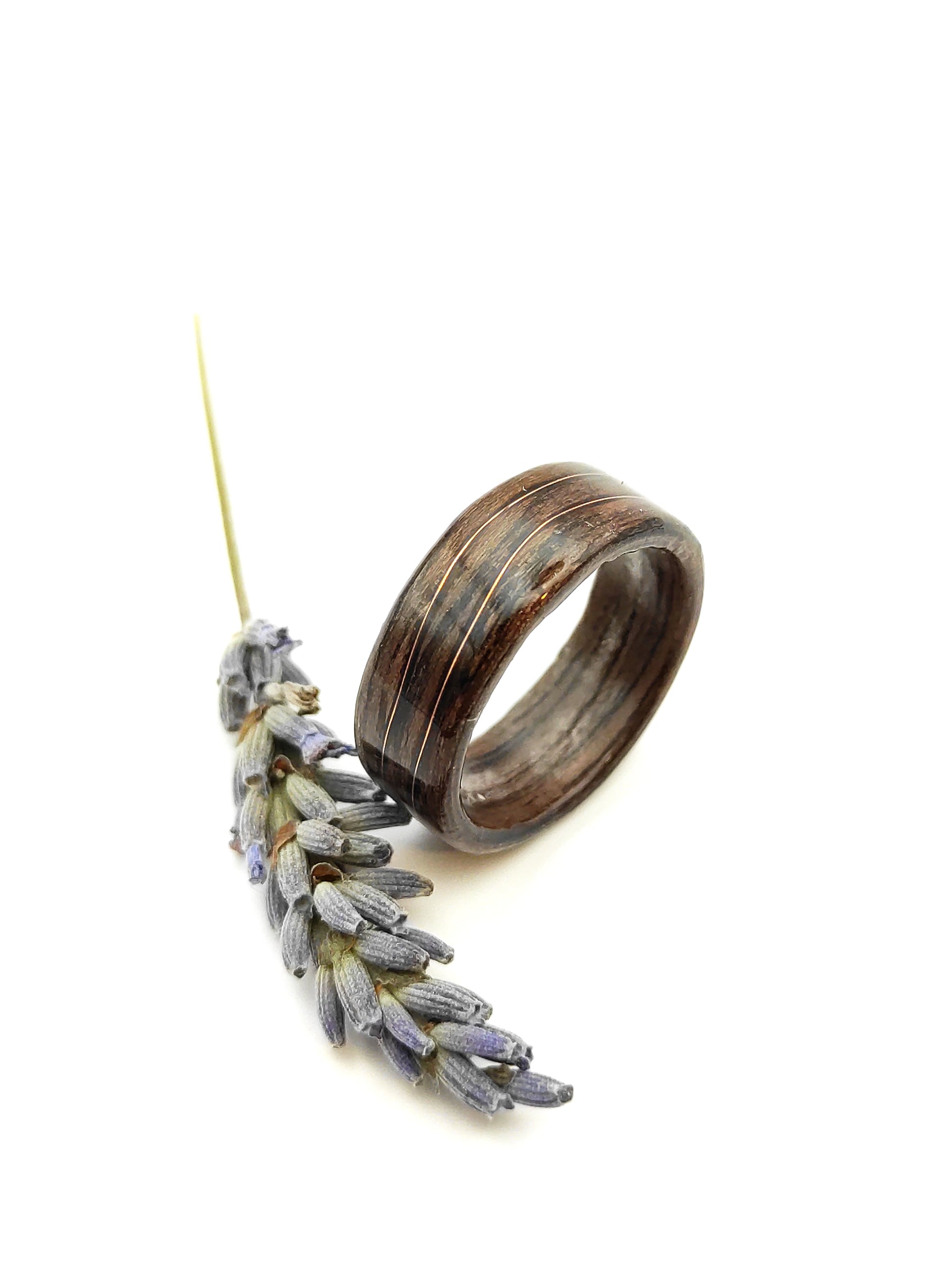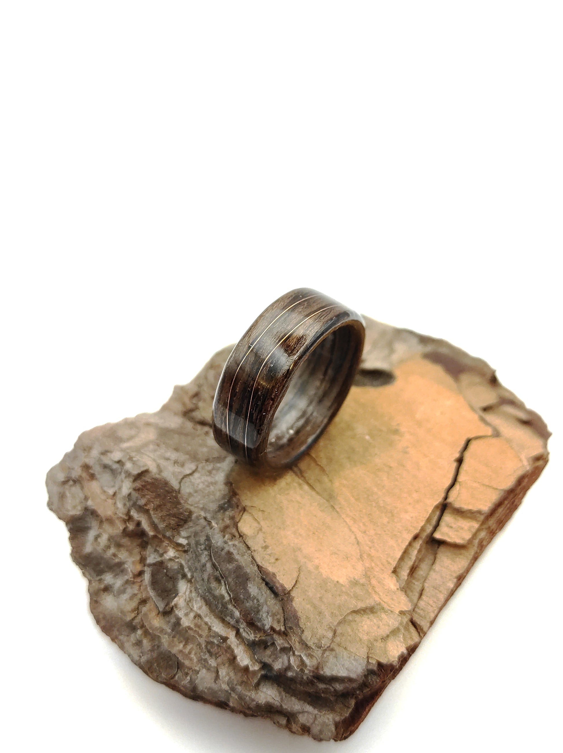 Ten pierścionek powstał z jednego z najbardziej charakterystycznych gatunków drewna – orzecha, który od wieków kojarzony jest z elegancją, ciepłem i szlachetnym wykończeniem. Jego głęboki, brązowy kolor z naturalnymi przejściami tonów sprawia, że każdy egzemplarz ma swój unikalny „rys”. Nie ma dwóch identycznych układów słojów, dlatego każdy pierścionek jest jedyny w swoim rodzaju.