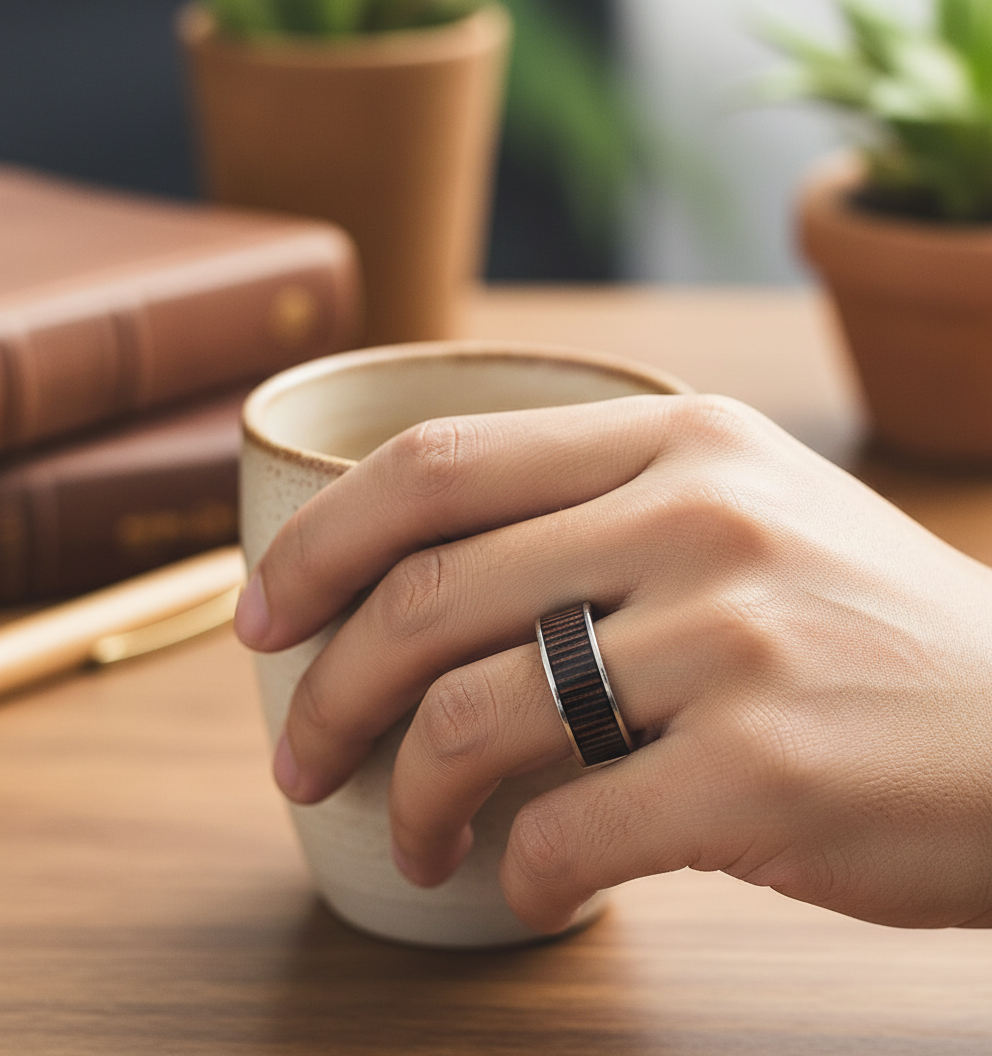 👉 Postaw na stal + drewno Wenge i noś pierścionek, który mówi coś o Tobie — moc, elegancja, naturalność.